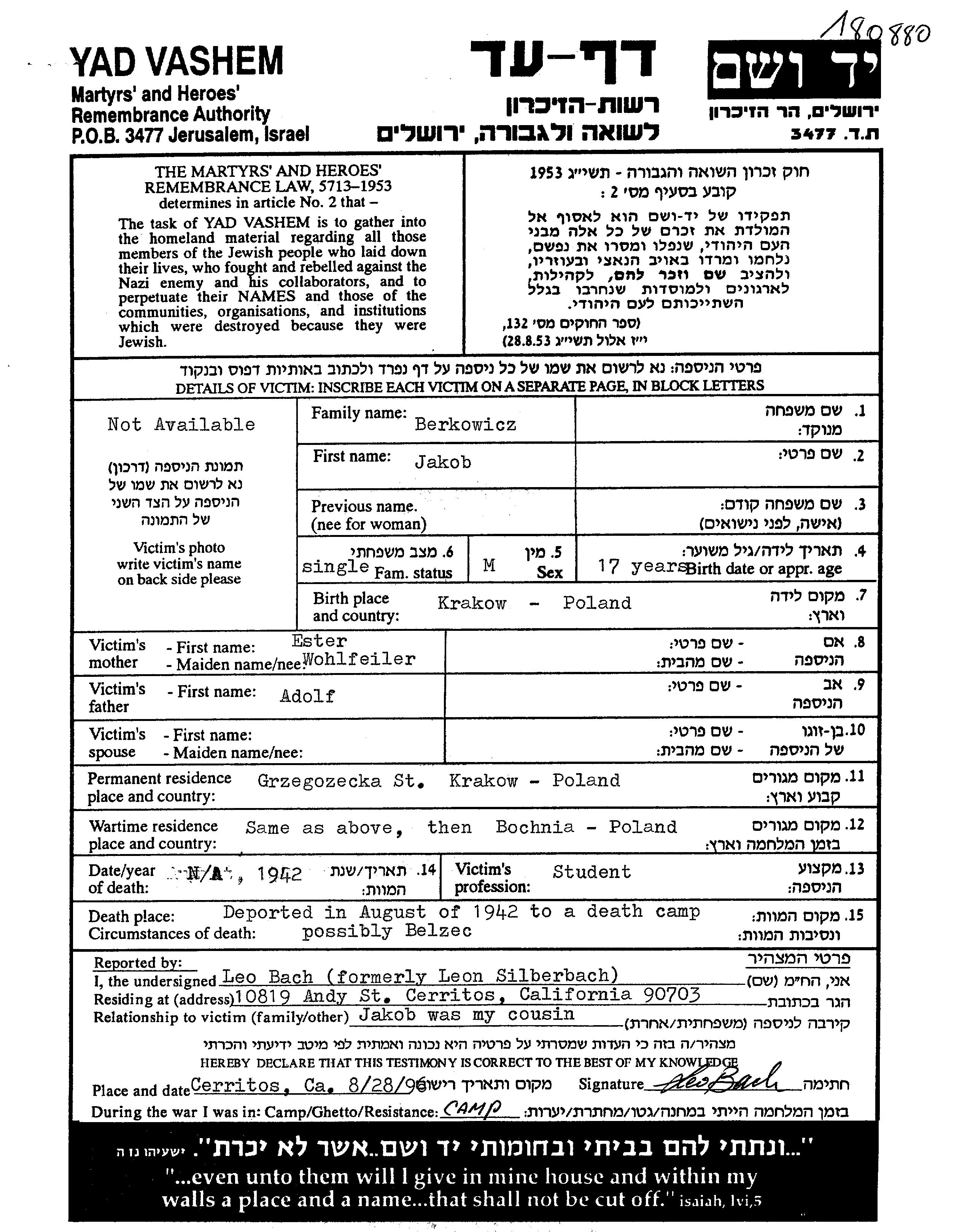 Jakob Berkowicz נולד בKrakow שבפולין לאדולף ואסתר לבית Wohlfeiler. הוא היה סטודנט וילד. לפני מלחמת העולם השניה התגורר בKrakow שבפולין. בזמן המלחמה הוא היה בBochnia שבפולין. הוא נרצח בשואה. מקום המוות: Belzec שבפולין בשנת 1942.