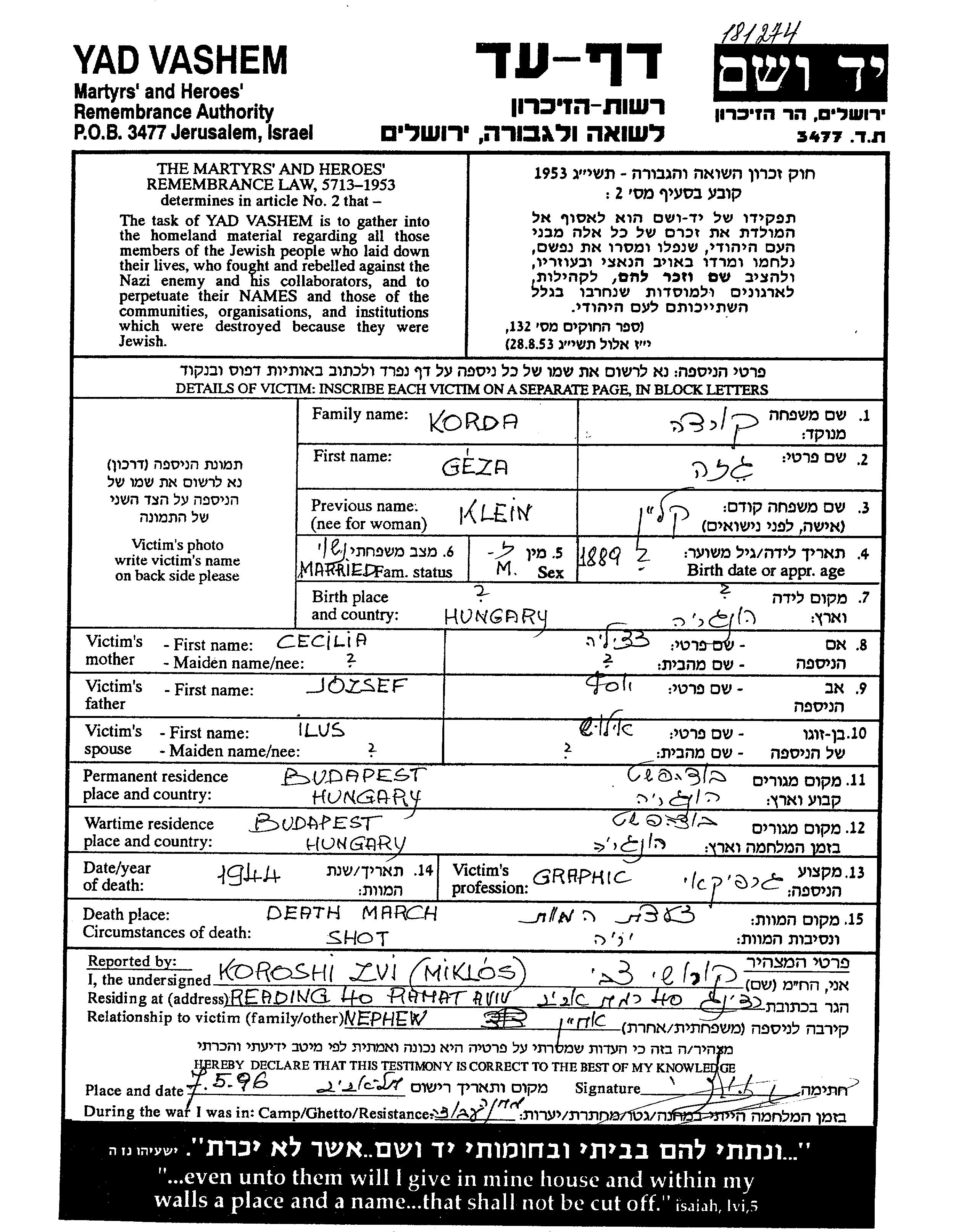 גזה קורדה קליין נולד בהונגריה בשנת 1889 לJozsef וCecilia. הוא היה צייר ונשוי לIlus. לפני מלחמת העולם השניה התגורר בBudapest שבהונגריה. בזמן המלחמה הוא היה בBudapest שבהונגריה. גזה נרצח בשואה. מקום המוות: לא ידוע בשנת 1944.