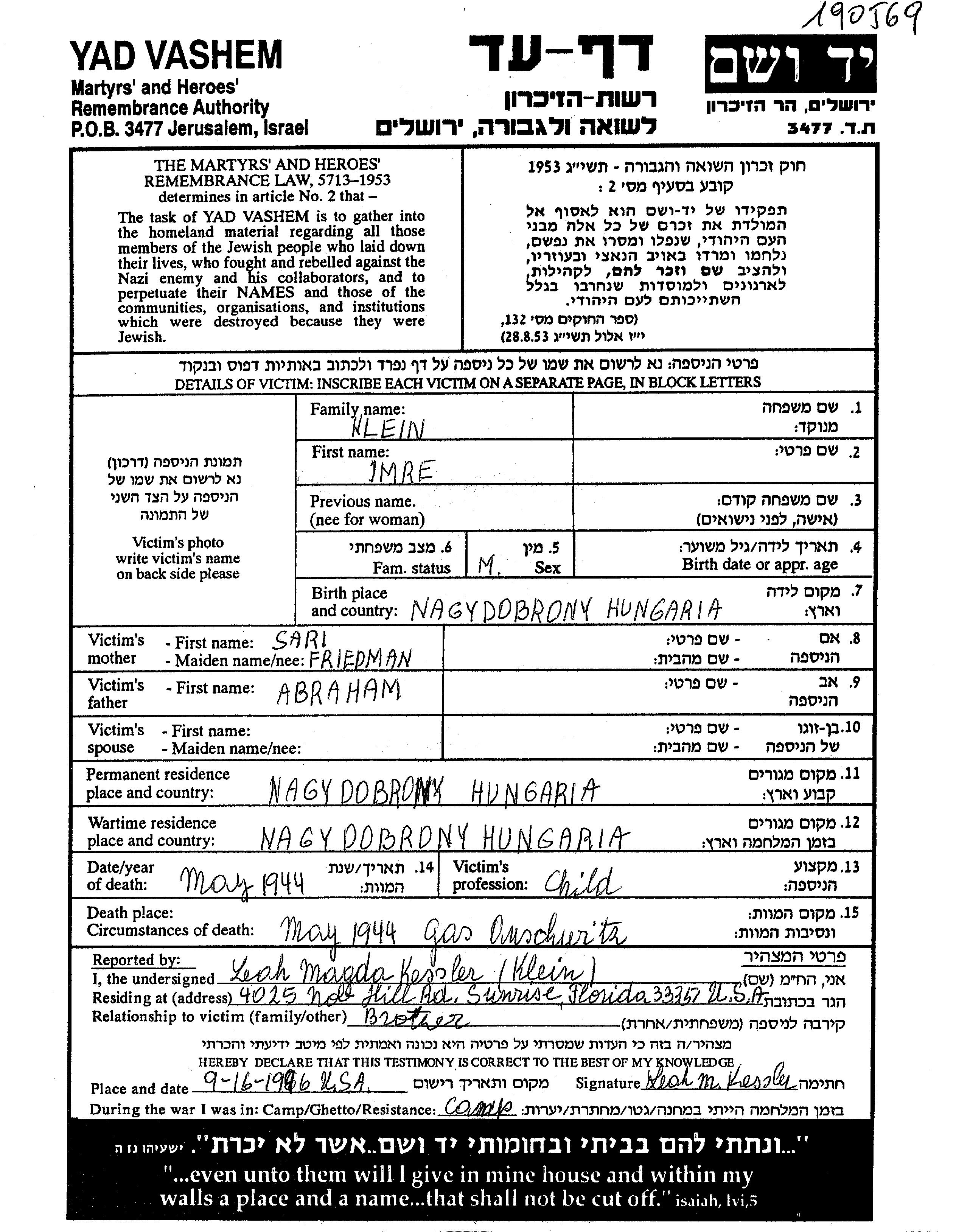 אימרה קליין נולד בNagydobrony שבצ'כוסלובקיה לAbraham וSari לבית Friedman. לפני מלחמת העולם השניה התגורר בNagydobrony שבצ'כוסלובקיה. בזמן המלחמה הוא היה בNagydobrony שבצ'כוסלובקיה. אימרה נרצח בשואה. מקום המוות: Auschwitz שבפולין בשנת 1944.