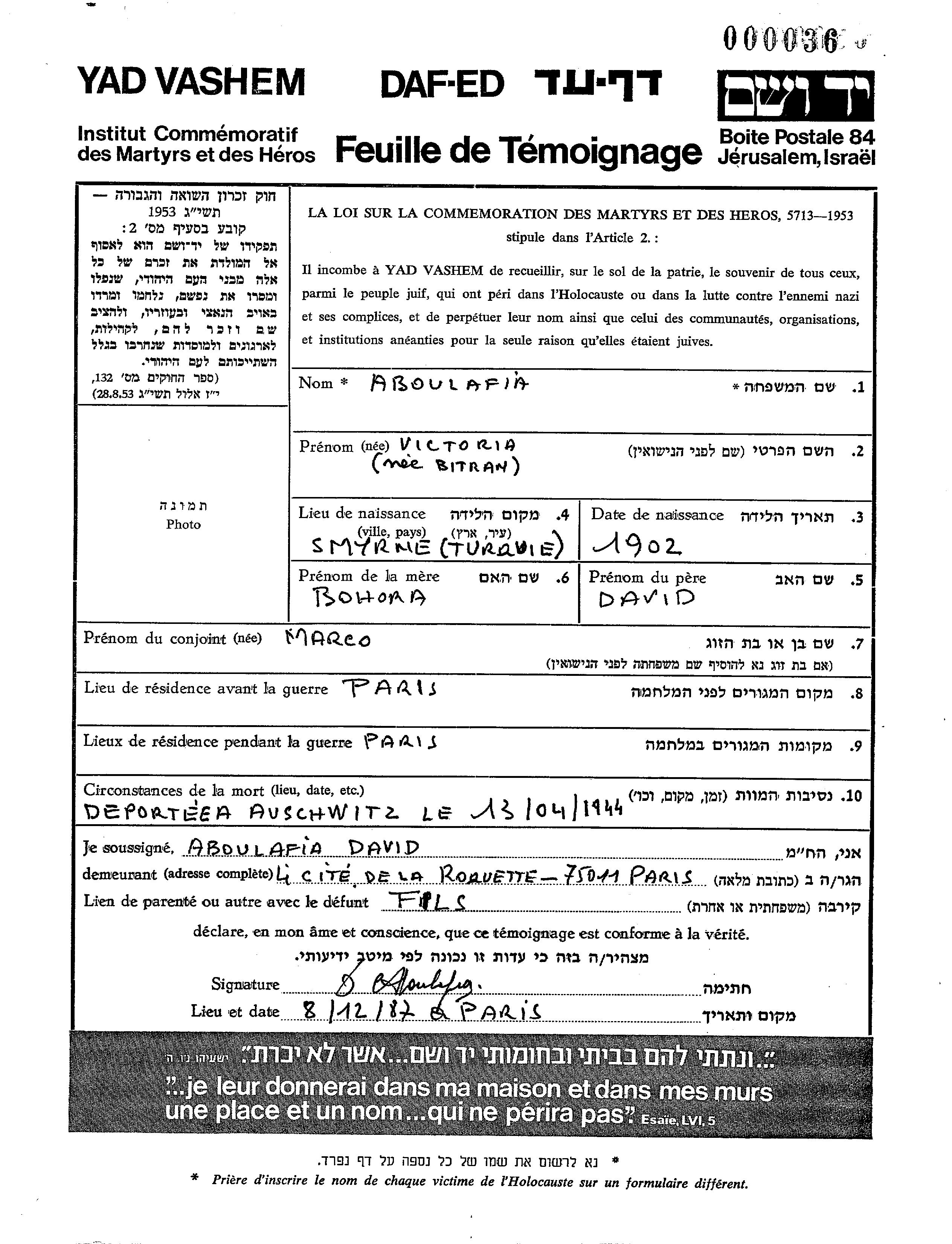 Victoria Aboulafia לבית ביטרן נולדה בSmyrna שבטורקיה בשנת 1902 לדוד וBohora. היא היתה נשואה לMarco. לפני מלחמת העולם השניה התגוררה בParis שבצרפת. בזמן המלחמה היא היתה בParis שבצרפת. היא נרצחה בשואה. מקום המוות: Auschwitz שבפולין בשנת 1944.