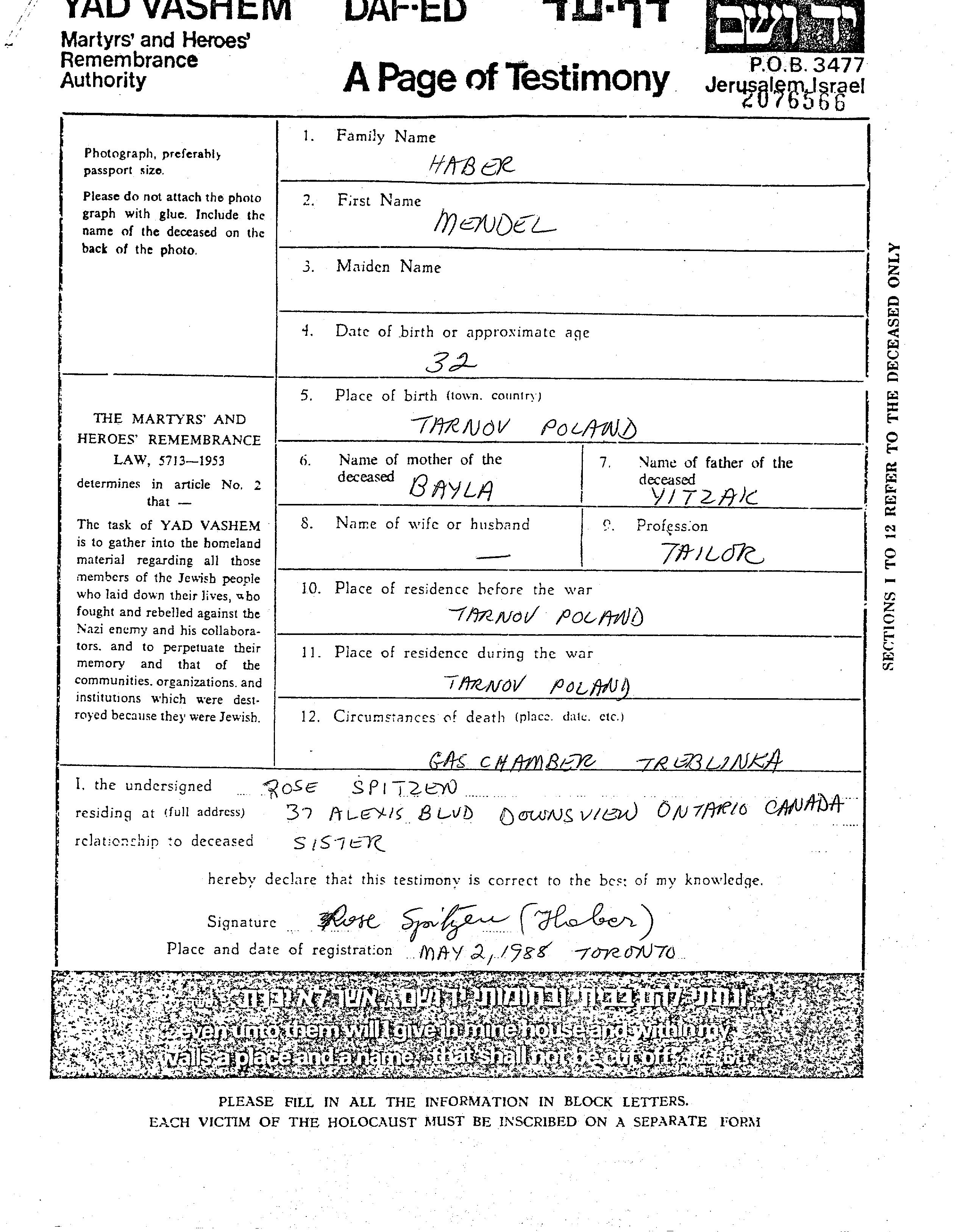 מנדל נרצח בשואה. מקום המוות: Treblinka שבפולין.