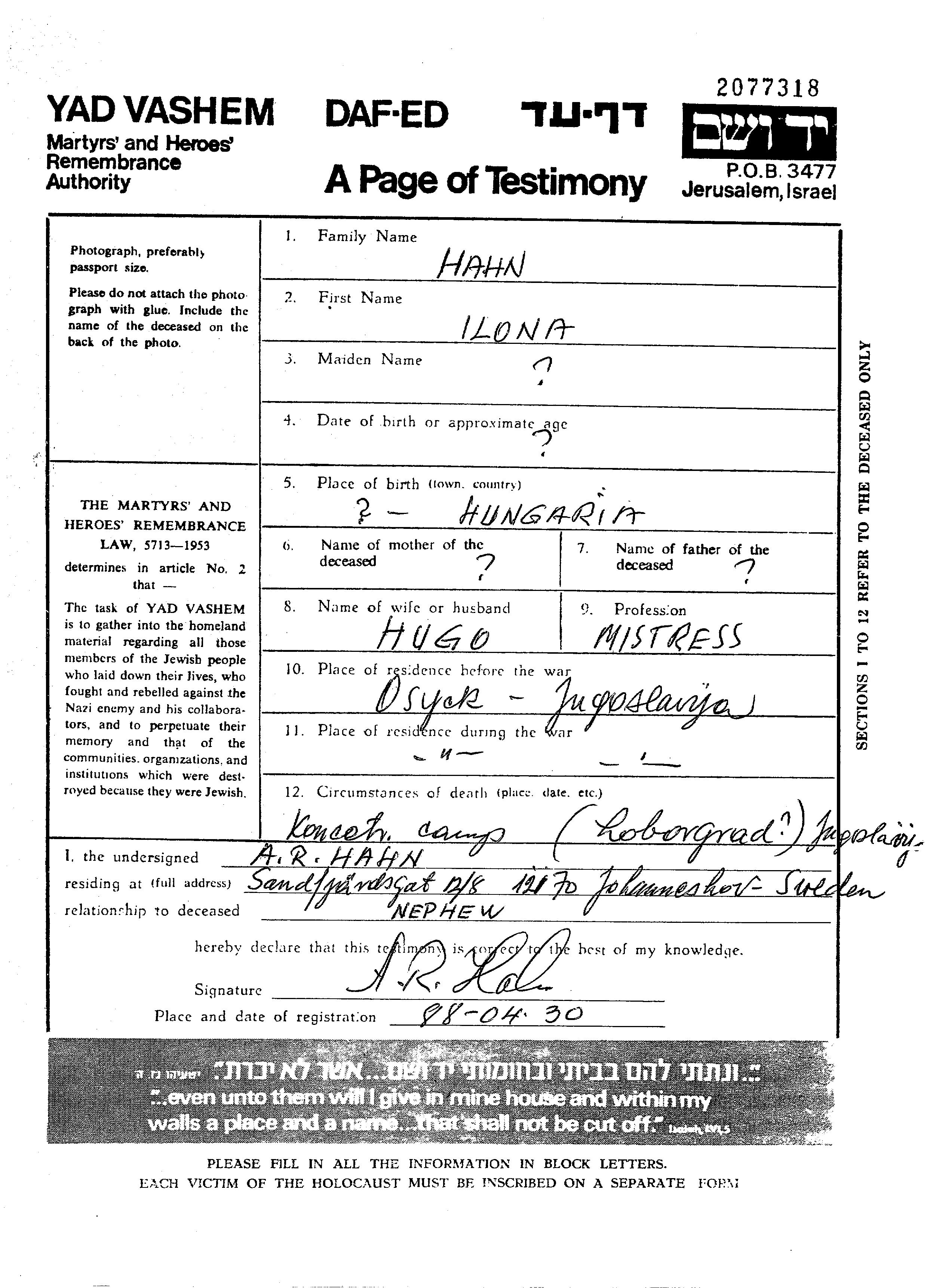 אילונה Hahn הן נולדה בהונגריה. היא היתה עקרת בית ונשואה להוגו. לפני מלחמת העולם השניה התגוררה בOsijek שביוגוסלביה. בזמן המלחמה היא היתה בOsijek שביוגוסלביה. אילונה נרצחה בשואה. מקום המוות: Loborgrad שביוגוסלביה.