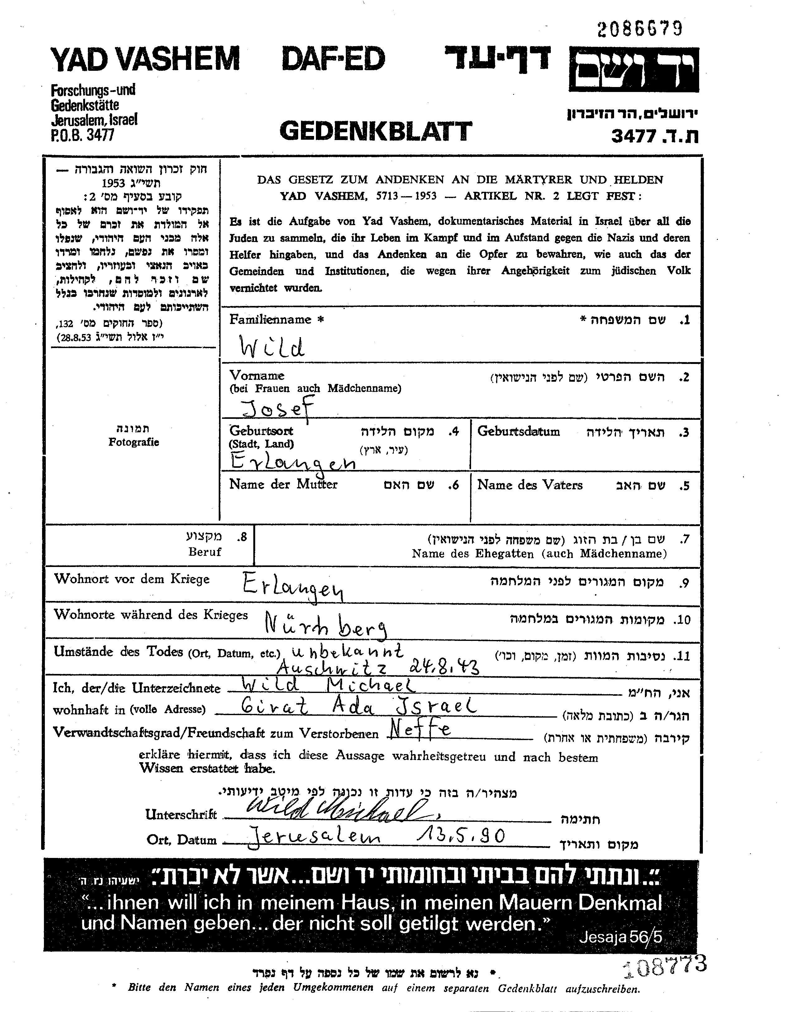 Josef Wild נולד בErlangen שבגרמניה. לפני מלחמת העולם השניה התגורר בErlangen שבגרמניה. בזמן המלחמה הוא היה בNuernberg שבגרמניה.