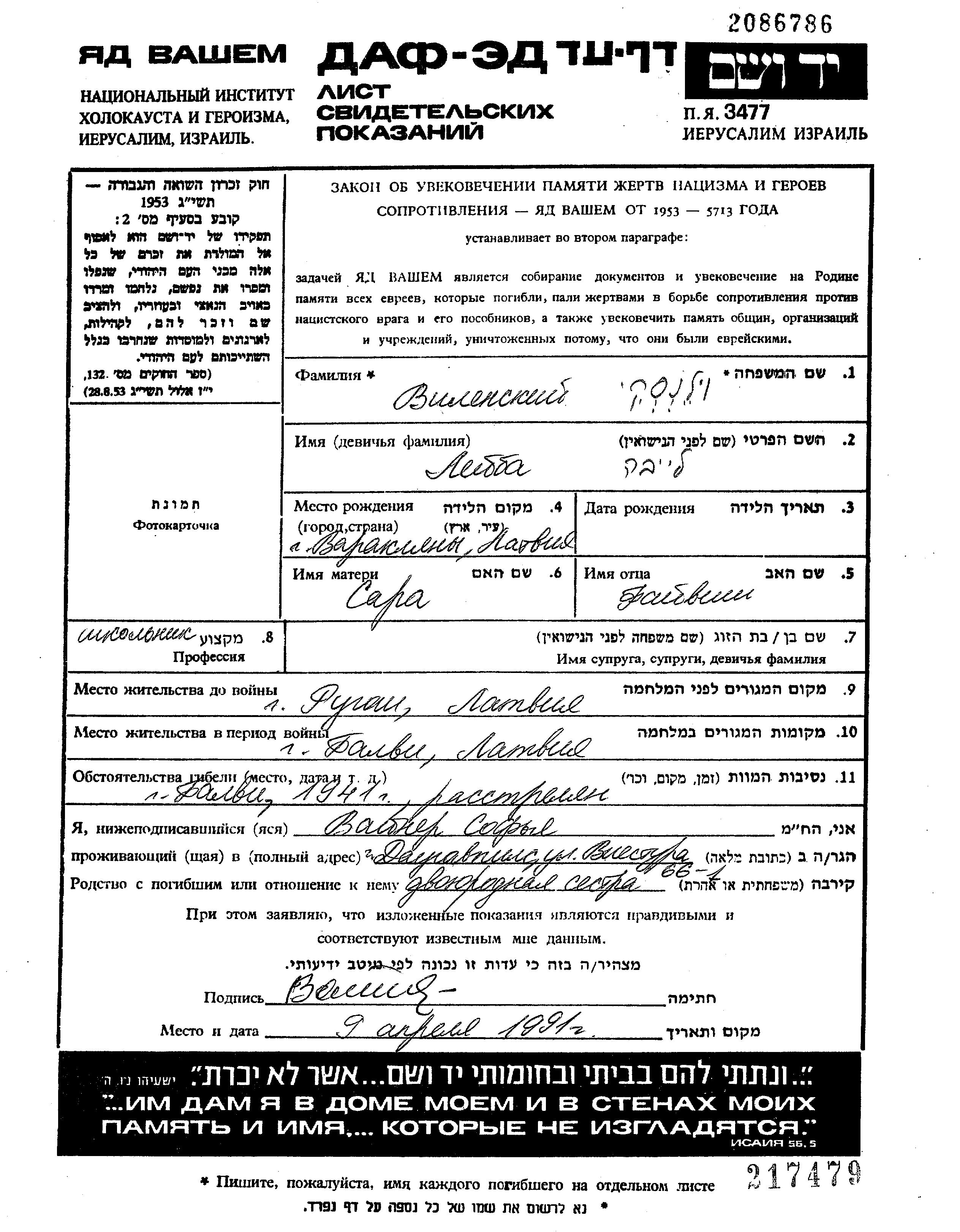 לייבה וילנסקי נולד בVaraklani שבלטביה לFaivish ושרה לבית פרזמה. הוא היה תלמיד וילד. לפני מלחמת העולם השניה התגורר בRugaji שבלטביה. בזמן המלחמה הוא היה בRugaji שבלטביה.