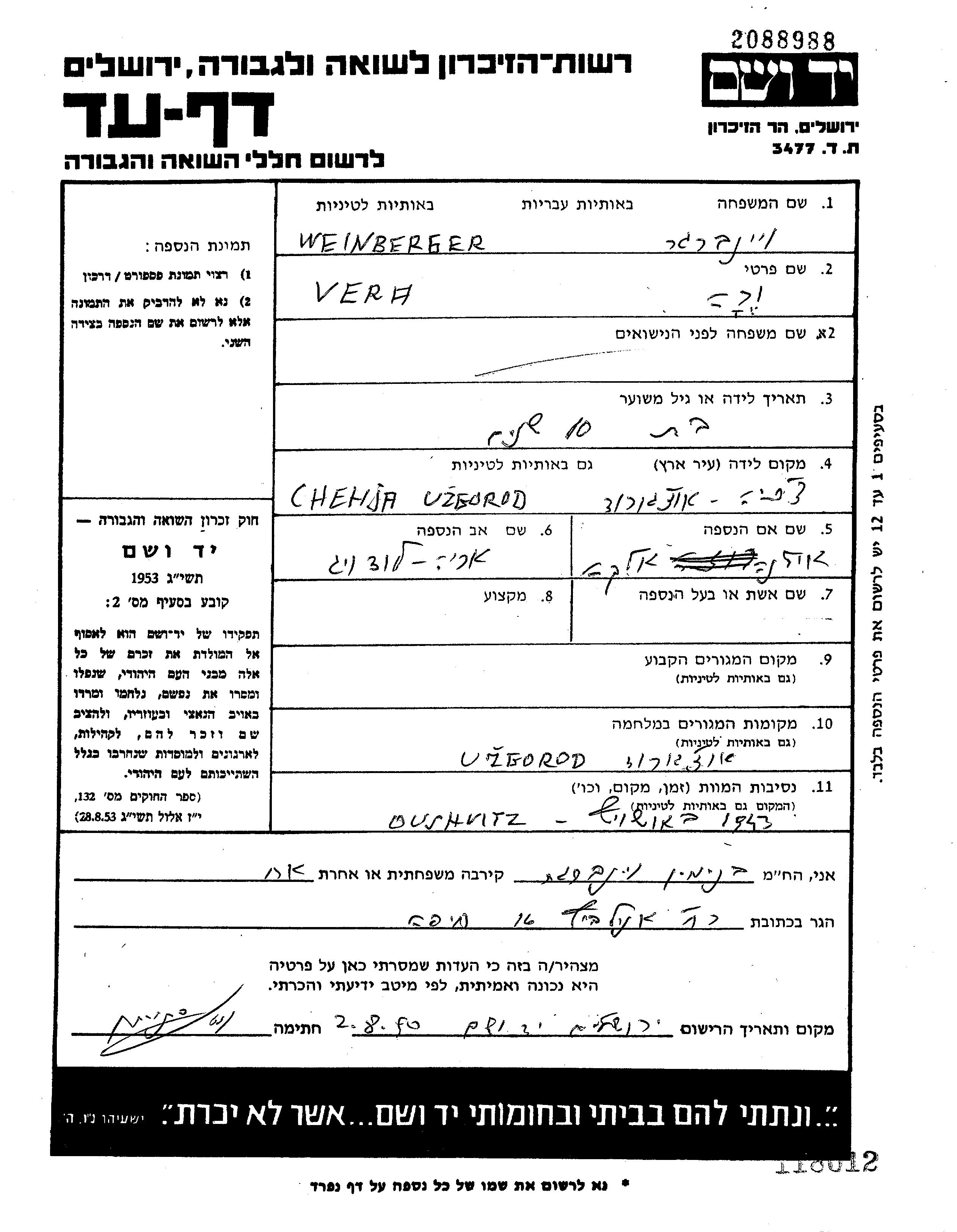 ורה Weinberger נולדה בUzhorod שבצ'כוסלובקיה בשנת 1933 לאריה לודוויג ואלקה. היא היתה תלמידה וילדה. לפני מלחמת העולם השניה התגוררה בUzhorod שבצ'כוסלובקיה. בזמן המלחמה היא היתה בUzhorod שבצ'כוסלובקיה. ורה נרצחה בשואה. מקום המוות: Auschwitz שבפולין בשנת 1943.