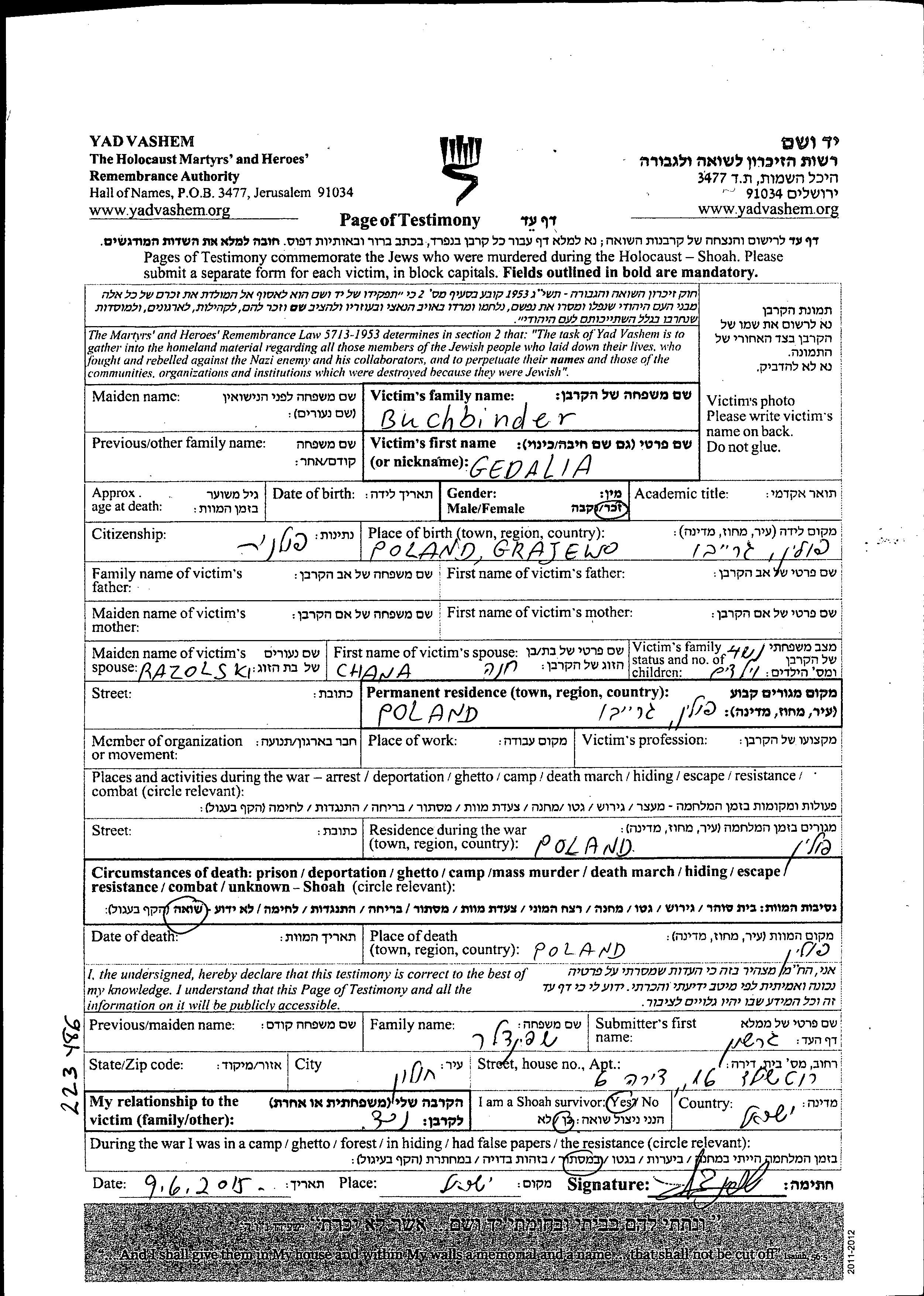 Gedalia Buchbinder נולד בGrajewo שבפולין. הוא היה נשוי לHana לבית Razolski. לפני מלחמת העולם השניה התגורר בGrajewo שבפולין. בזמן המלחמה הוא היה בפולין שבפולין. הוא נרצח בשואה. מקום המוות: פולין שבפולין.