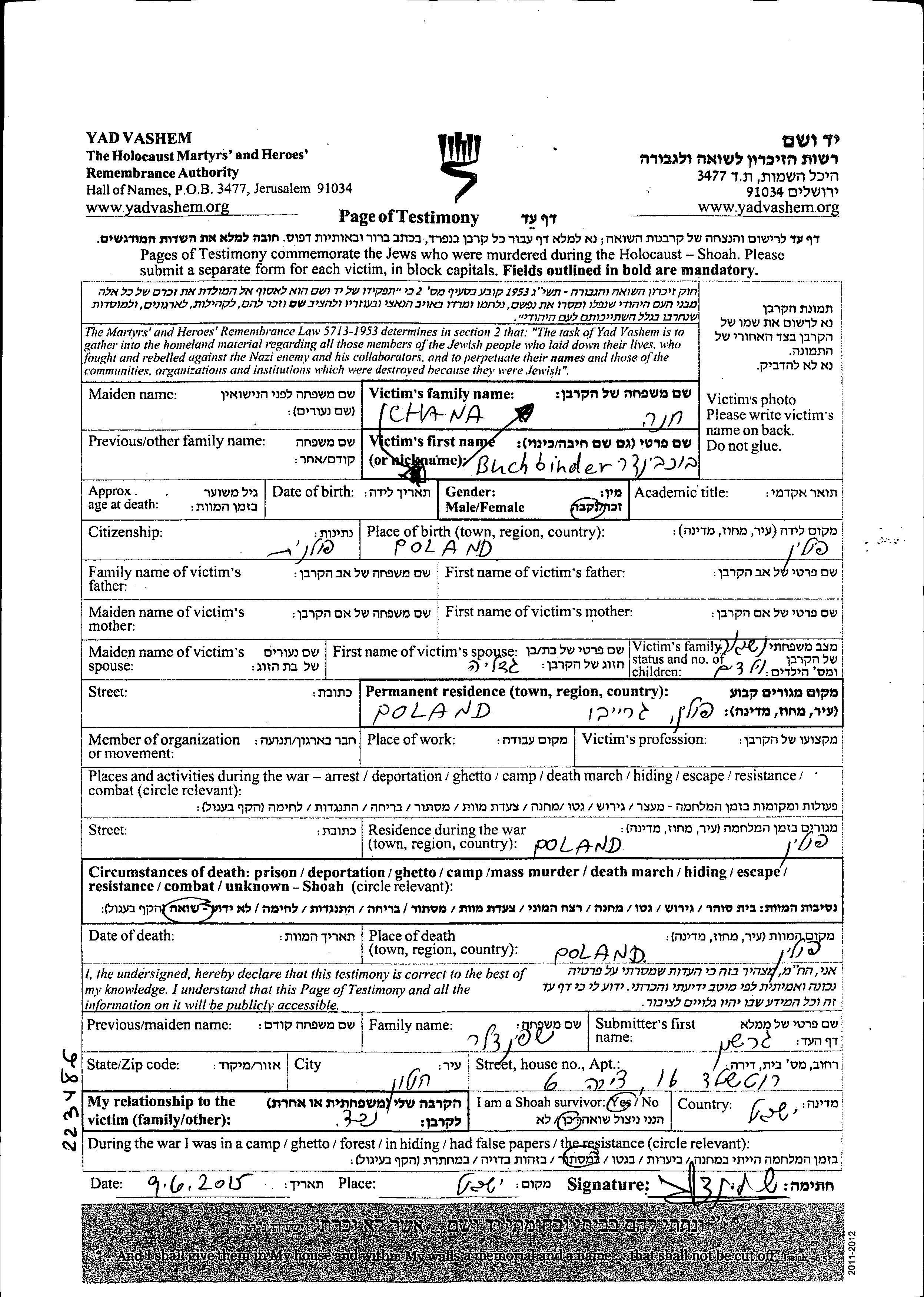 Chana Buchbinder נולדה בפולין שבפולין. היא היתה נשואה לגדליה. לפני מלחמת העולם השניה התגוררה בGrajewo שבפולין. בזמן המלחמה היא היתה בפולין שבפולין. היא נרצחה בשואה. מקום המוות: פולין שבפולין.