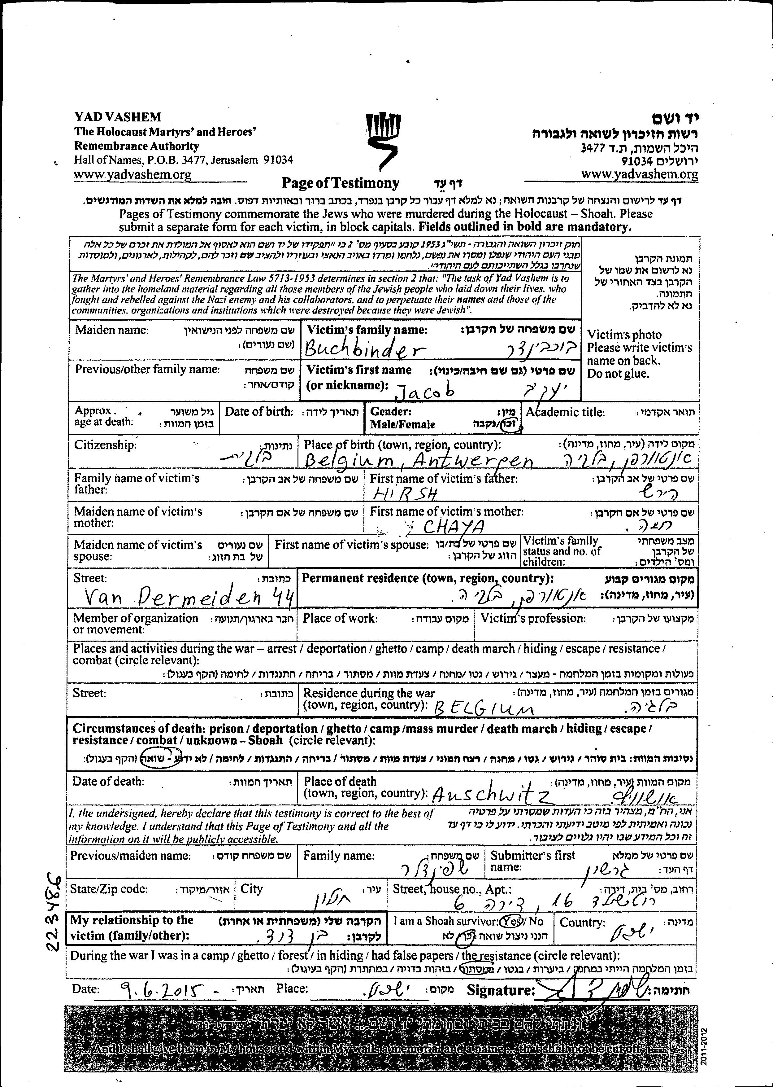 Jacob Buchbinder נולד בAntwerpen שבבלגיה לHirsh וChaya חנה. לפני מלחמת העולם השניה התגורר בAntwerpen שבבלגיה. בזמן המלחמה הוא היה ב<> (<>), בלגיה שבבלגיה. הוא נרצח בשואה. מקום המוות: Auschwitz שבפולין.