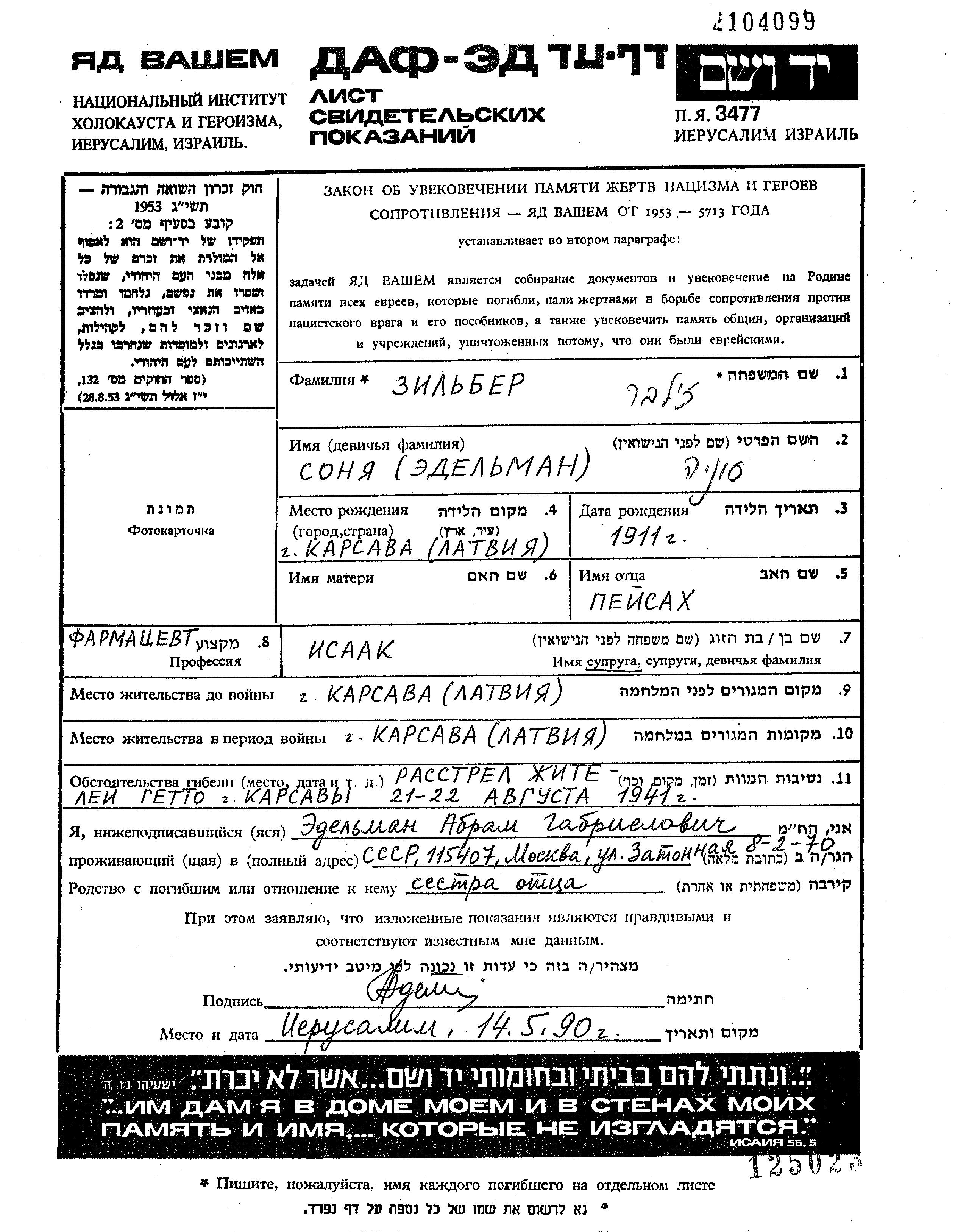 Sonya זילבר לבית אדלמן נולדה בKarsava שבלטביה לפייסח. היא היתה רוקחת ונשואה לIsaak. לפני מלחמת העולם השניה התגוררה בKarsava שבלטביה. בזמן המלחמה היא היתה בKarsava שבלטביה.