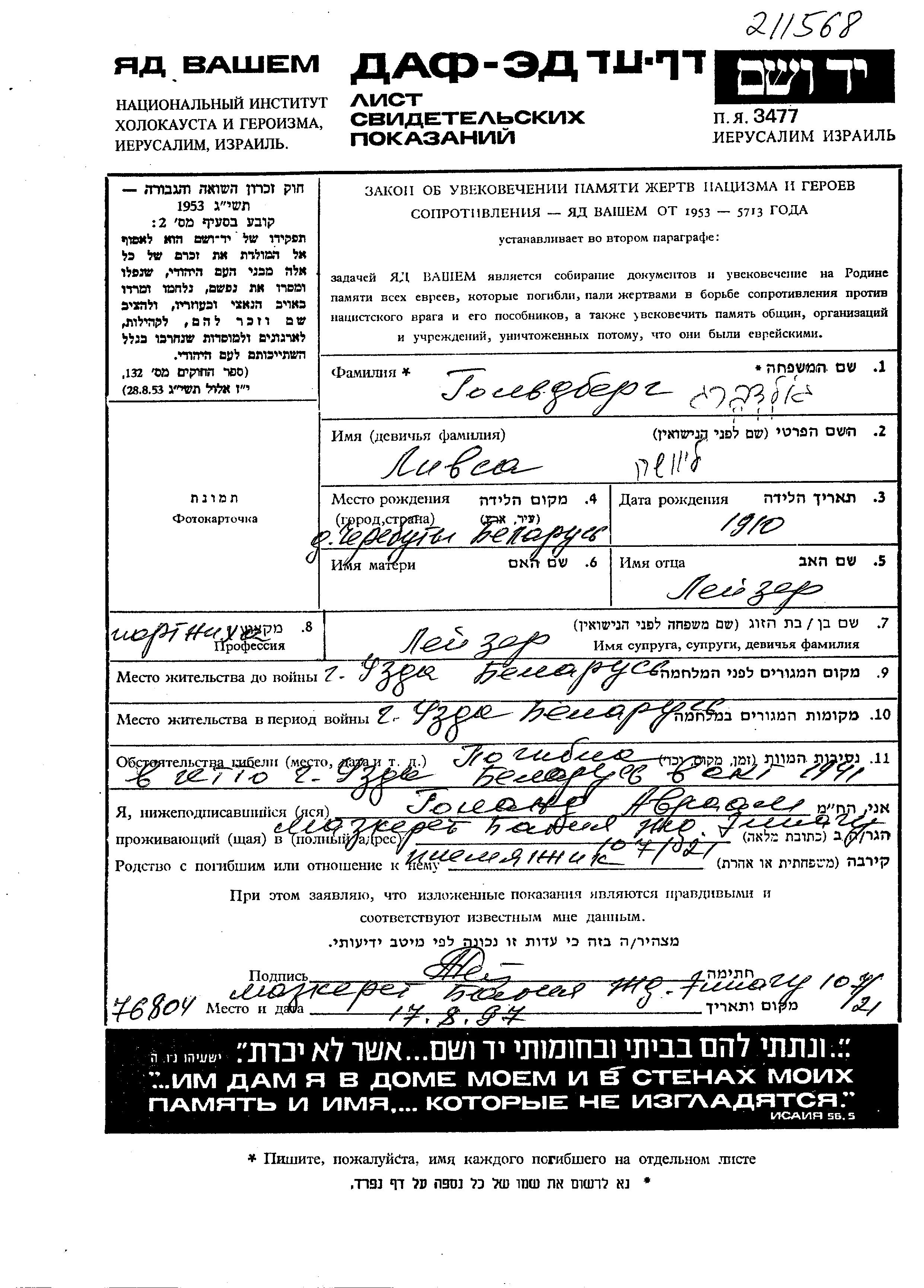 Livsa גולדברג נולדה בTerebuty שבביאלורוסיה (ברה"מ) בשנת 1910 ללייזר. היא היתה תופרת ונשואה ללייזר. לפני מלחמת העולם השניה התגוררה בUzda שבביאלורוסיה (ברה"מ). בזמן המלחמה היא היתה בUzda שבביאלורוסיה (ברה"מ).