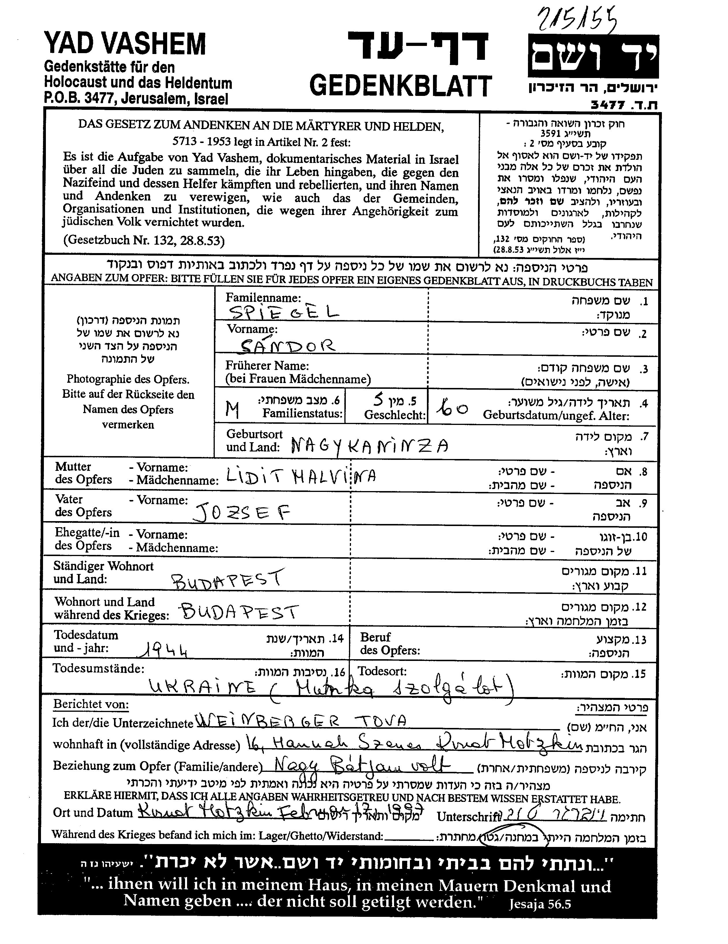 סנדור נרצח בשואה. מקום המוות: אוקראינה (ברה"מ) בשנת 1944.