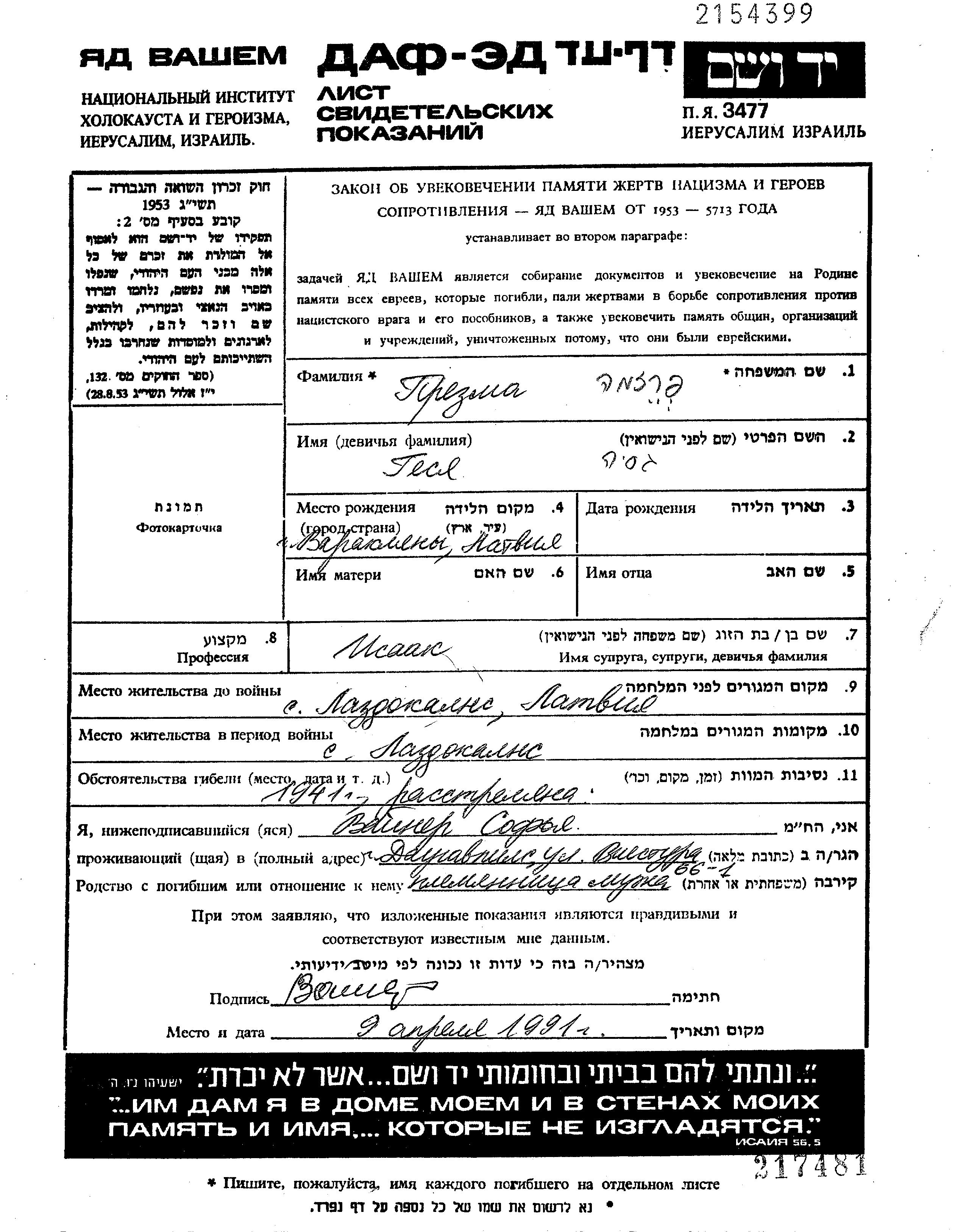גסיה פרזמה נולדה בVaraklani שבלטביה. היא היתה נשואה לIsaak. לפני מלחמת העולם השניה התגוררה בLazdukalns שבלטביה. בזמן המלחמה היא היתה בLazdukalns שבלטביה.