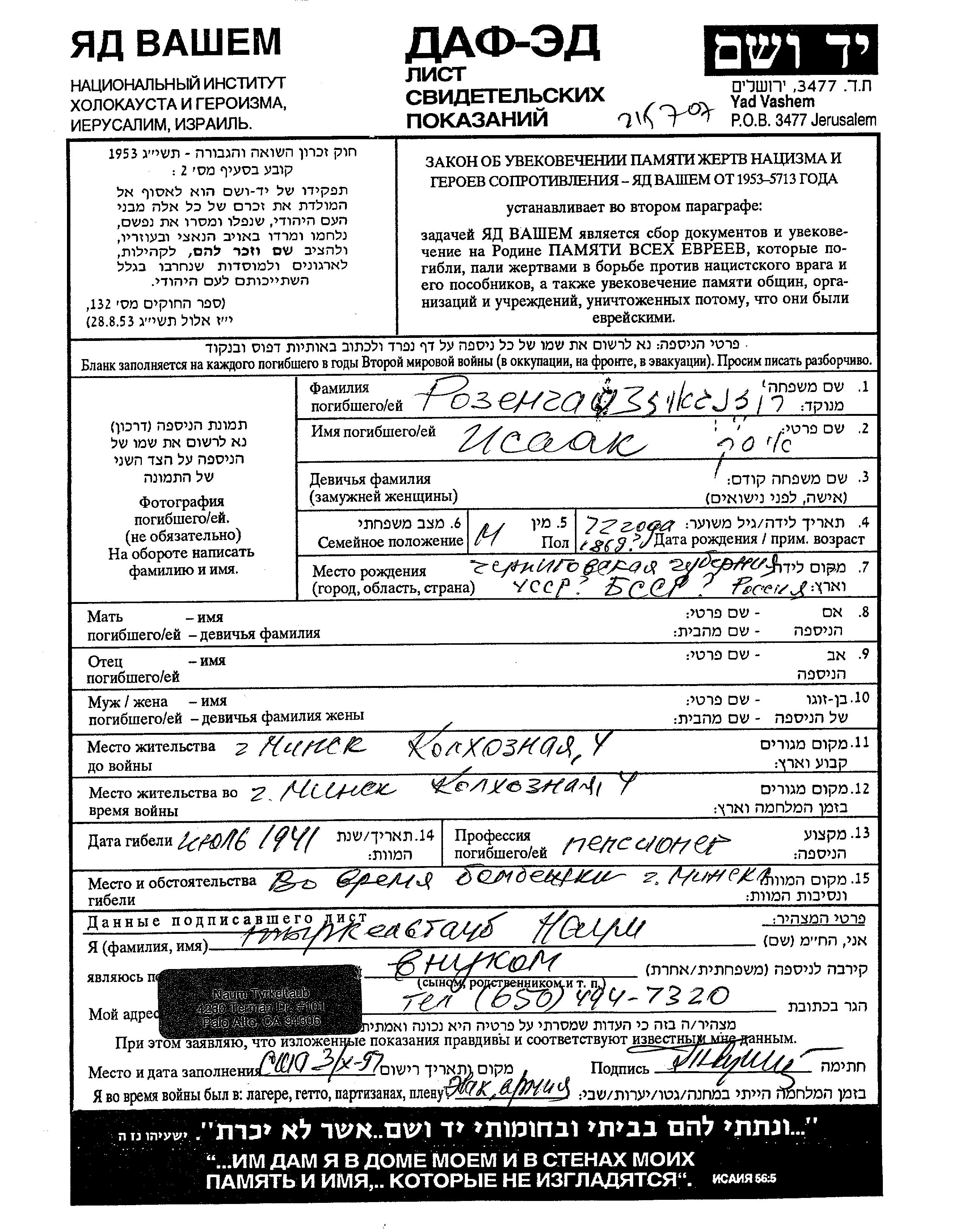 הוא נרצח בשואה. מקום המוות: Minsk שבביאלורוסיה (ברה"מ) בשנת 1941.