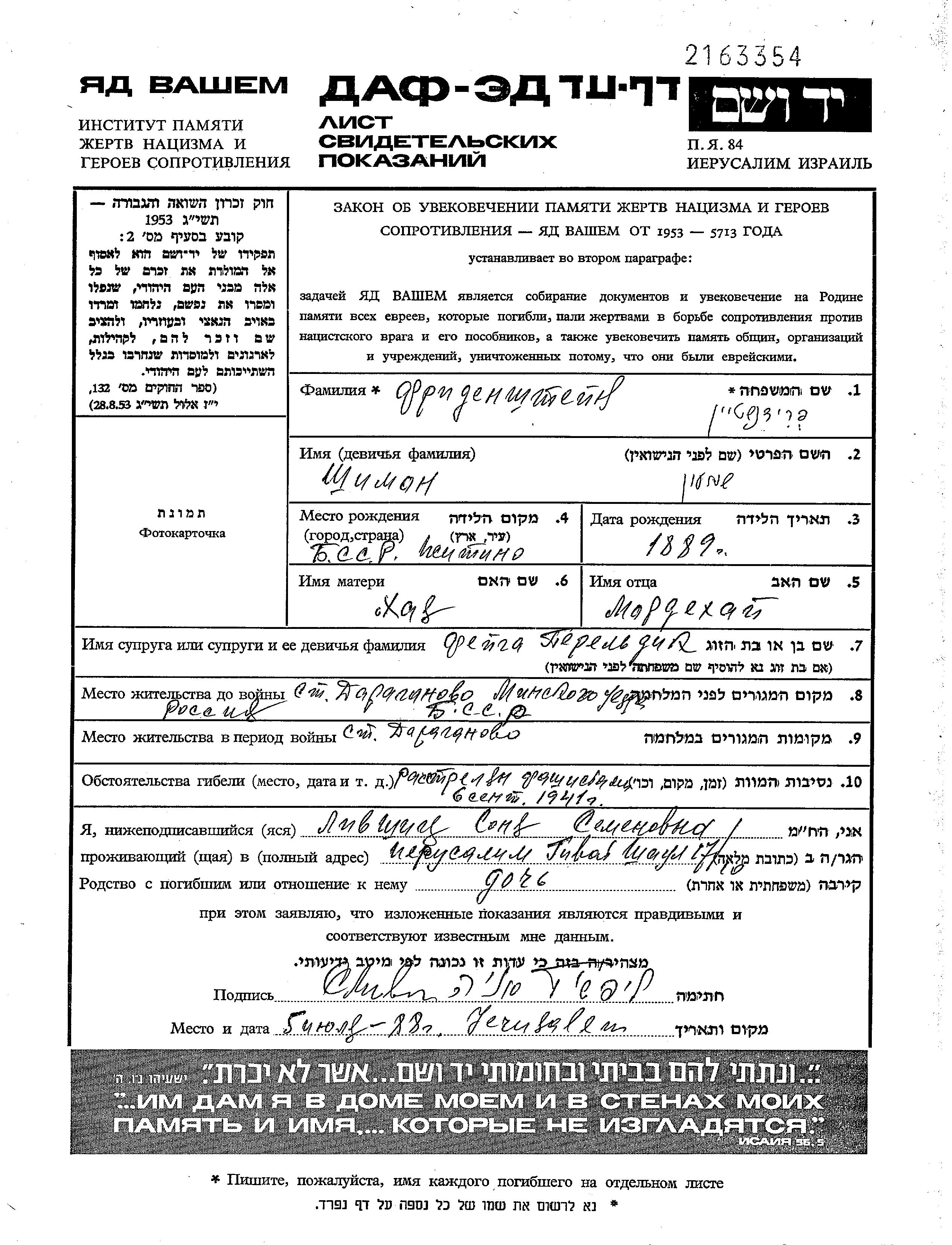 שמעון נרצח בשואה. מקום המוות: Doroganovo שבביאלורוסיה (ברה"מ) בשנת 06/09/1941.