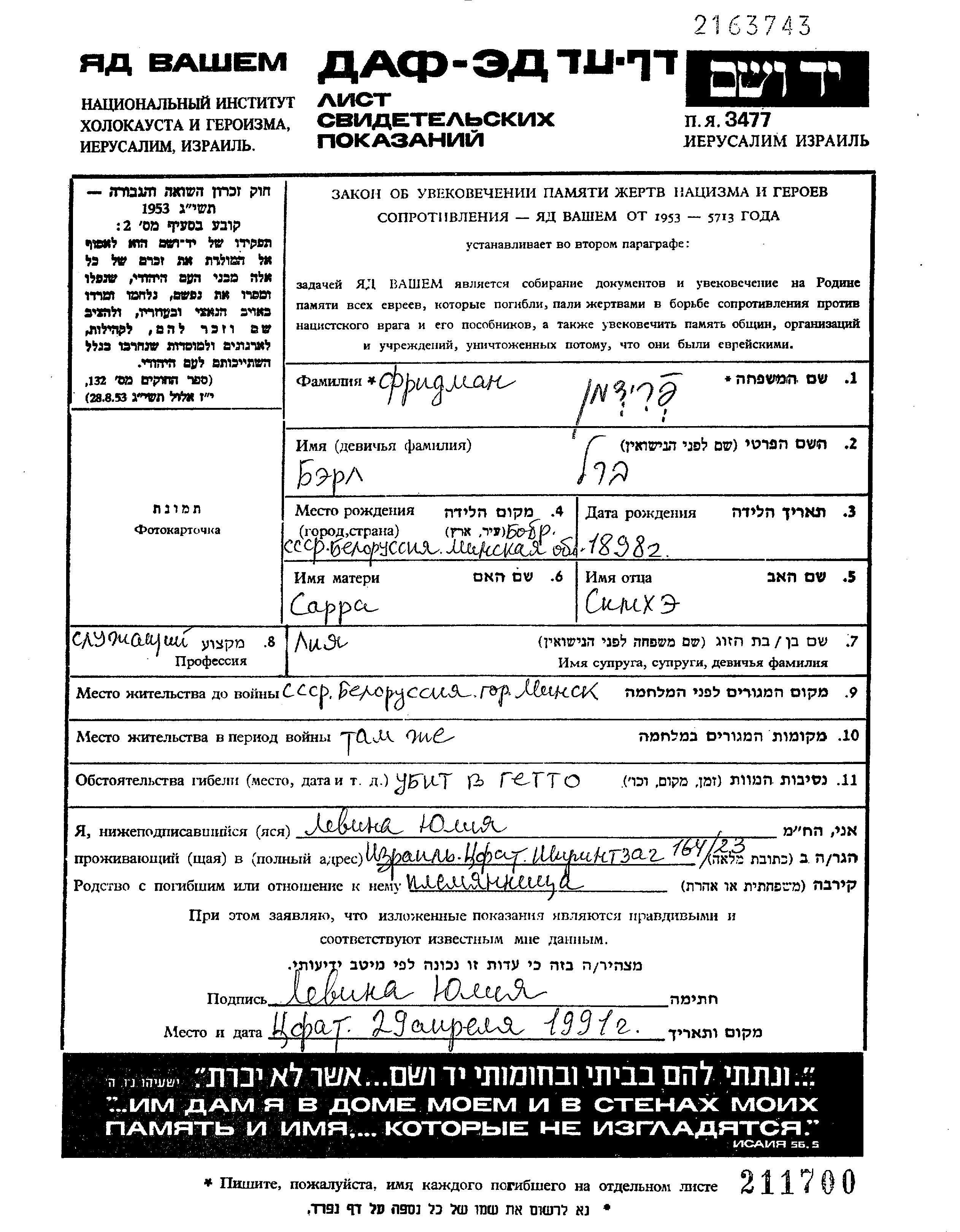 פרידמן Berl 1898 Minsk, ביאלורוסיה (ברה"מ) דף-עד