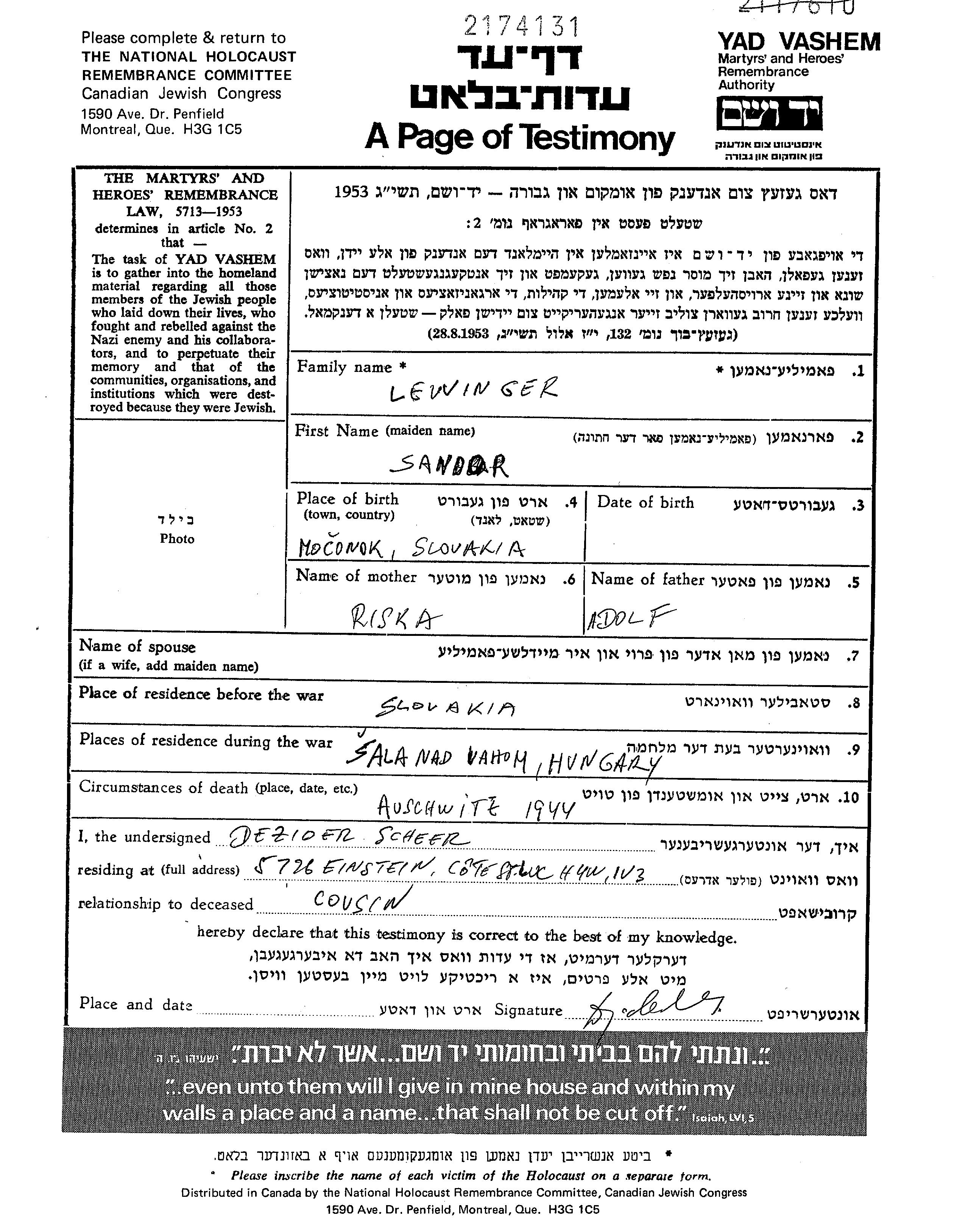 סנדור נרצח בשואה. מקום המוות: Auschwitz שבפולין בשנת 1944.