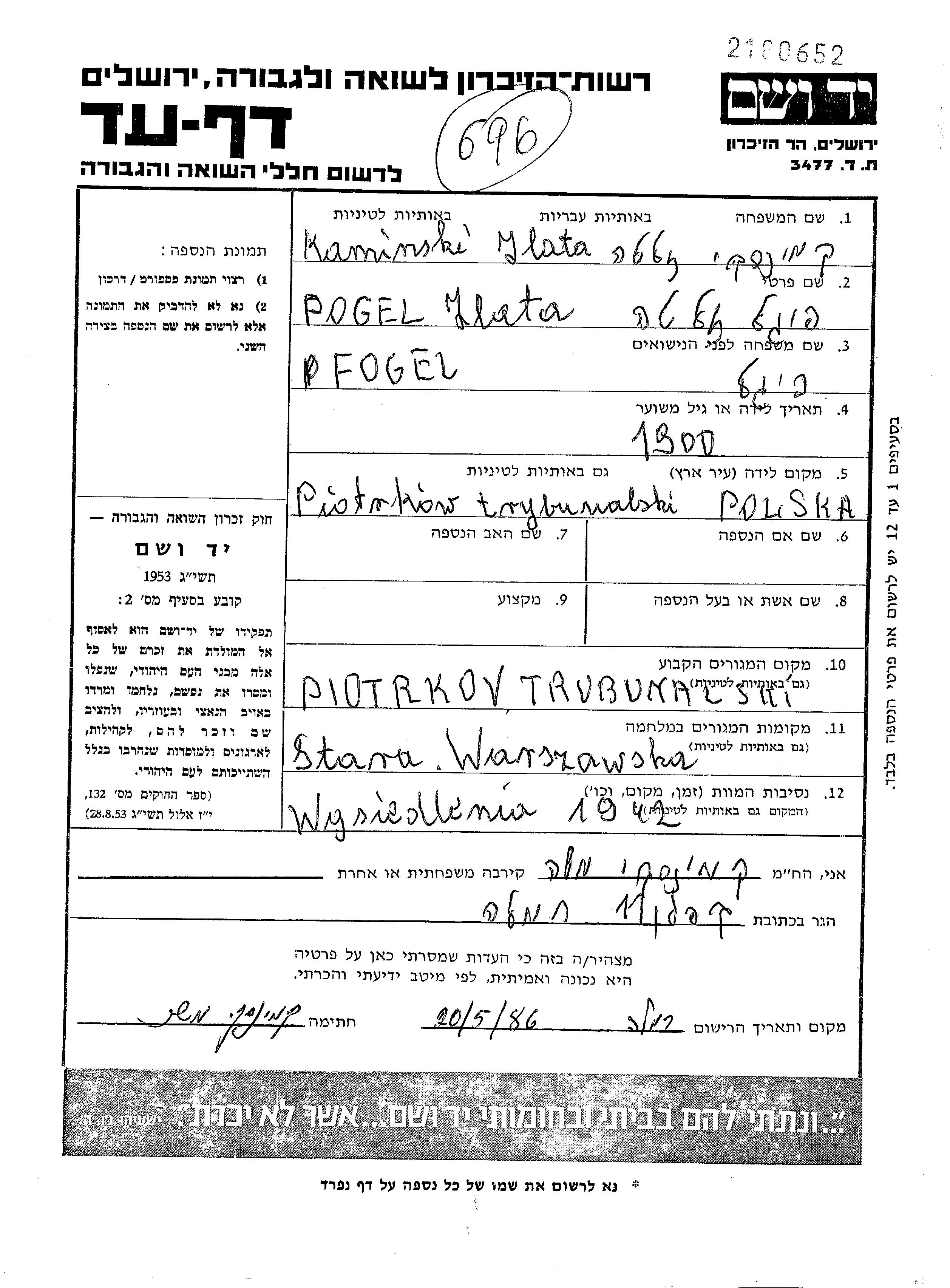 זלטה קמינסקי לבית פוגל נולדה בPiotrkow Trybunalski שבפולין בשנת 1900. היא היתה נשואה לZvi. לפני מלחמת העולם השניה התגוררה בPiotrkow Trybunalski שבפולין. בזמן המלחמה היא היתה בPiotrkow Trybunalski שבפולין.