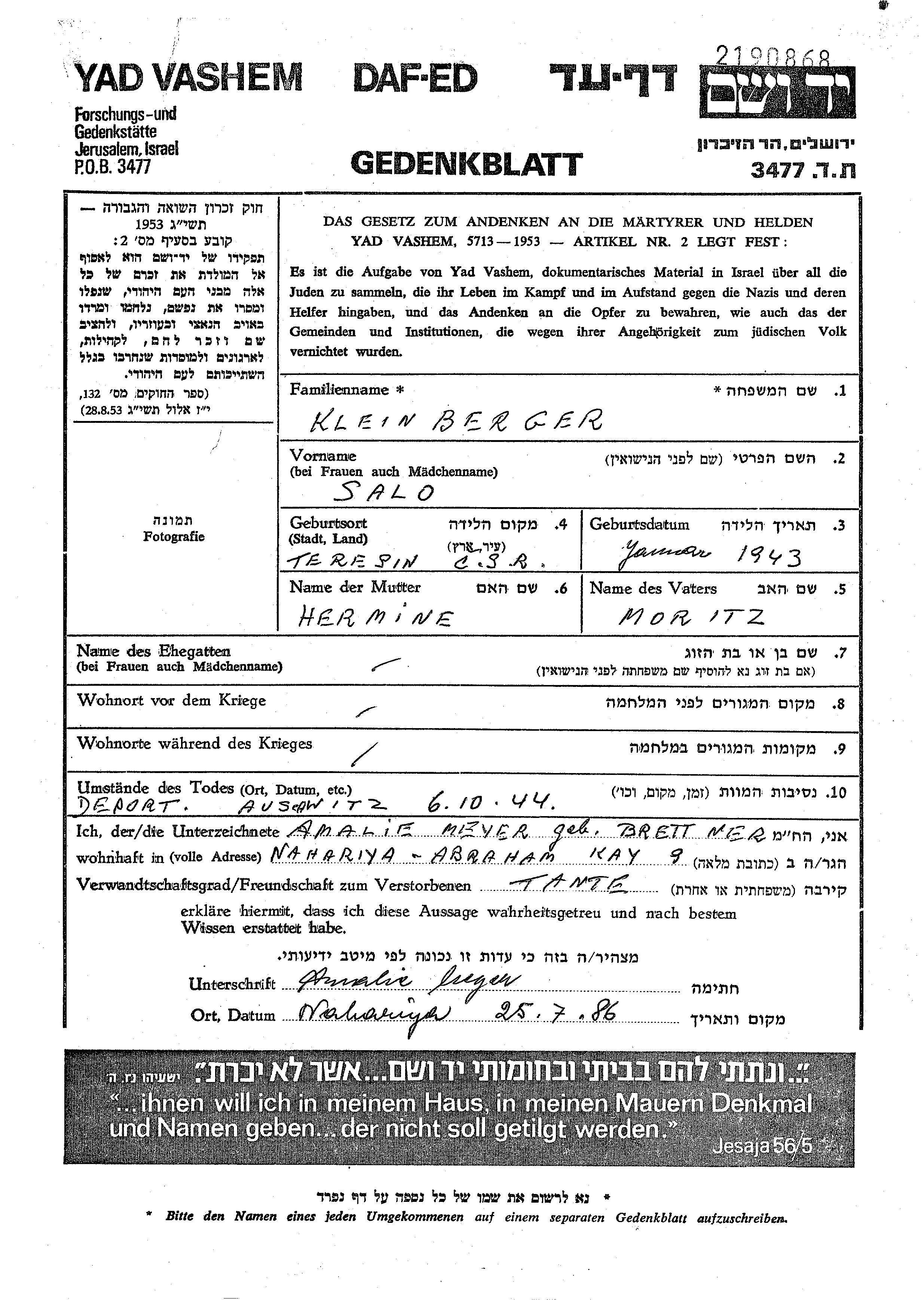 Salo קלינברגר נולד בTheresienstadt שבצ'כוסלובקיה בשנת 1943 למוריץ וHermine לבית Brettner. הוא היה ילד. בזמן המלחמה הוא היה בצ'כוסלובקיה. הוא נרצח בשואה. מקום המוות: Auschwitz שבפולין בשנת 1944.
