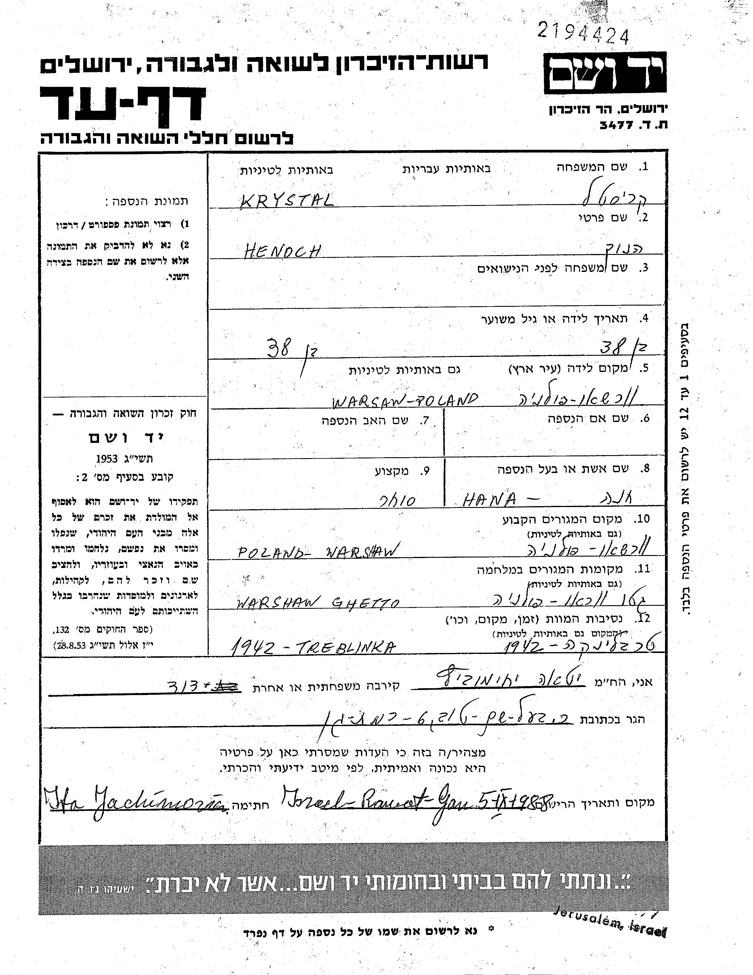 הנוך Krystal נולד בWarszawa שבפולין בשנת 1904. הוא היה סוחר ונשוי לHanah. לפני מלחמת העולם השניה התגורר בWarszawa שבפולין. בזמן המלחמה הוא היה בWarszawa שבפולין.