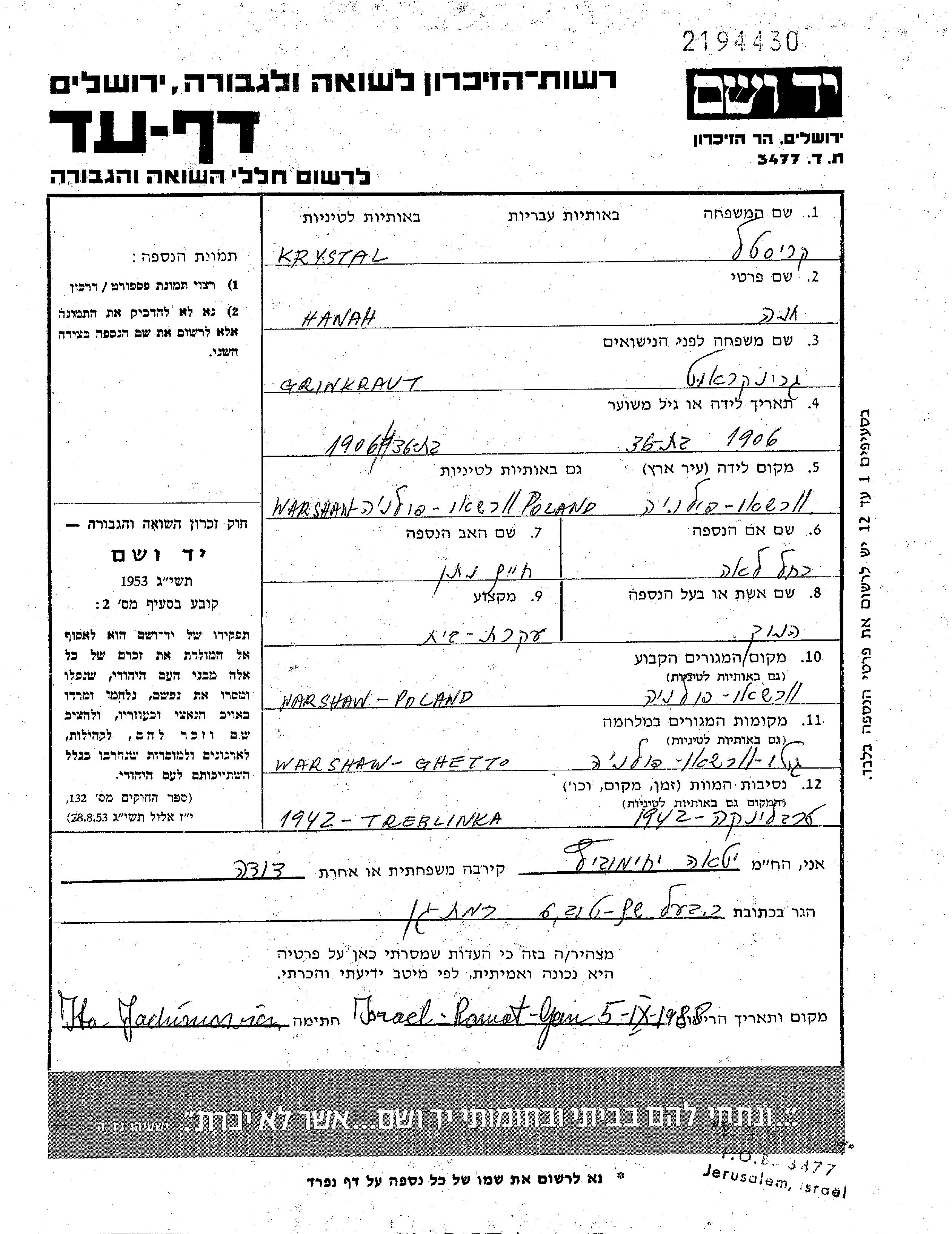 Hanah Krystal לבית גרינקראוט נולדה בWarszawa שבפולין בשנת 1906 לחיים נתן ורחל לאה. היא היתה עקרת בית ונשואה להנוך. לפני מלחמת העולם השניה התגוררה בWarszawa שבפולין. בזמן המלחמה היא היתה בWarszawa שבפולין. היא נרצחה בשואה. מקום המוות: Treblinka שבפולין בשנת 1942.
