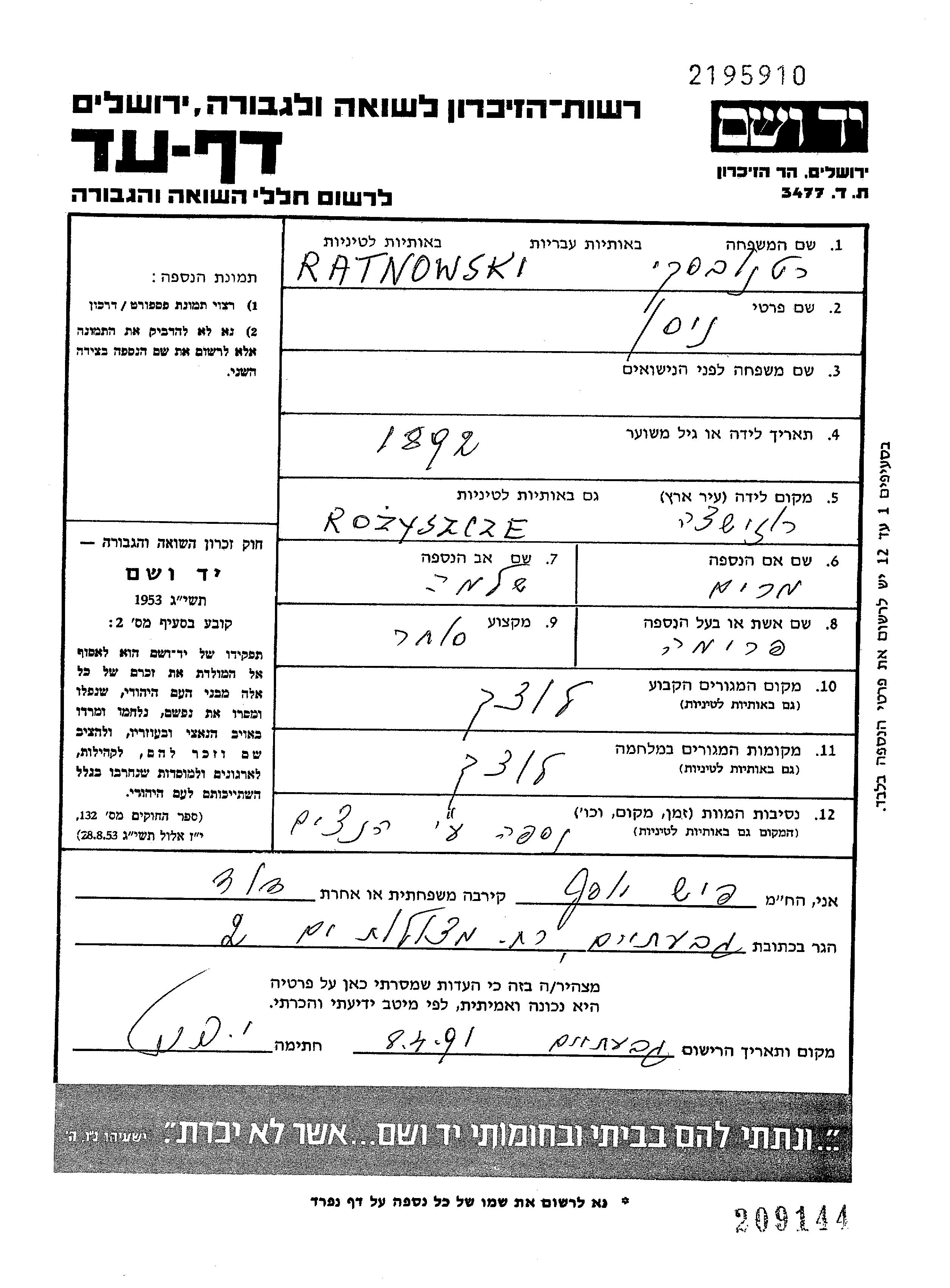 ניסן Ratnowski נולד בRozyszcze שבפולין בשנת 1892 לשלומה ומרים לבית פוגטש פוגץ. הוא היה סוחר ונשוי לFrima. לפני מלחמת העולם השניה התגורר בLuck שבפולין. בזמן המלחמה הוא היה בLuck שבפולין.