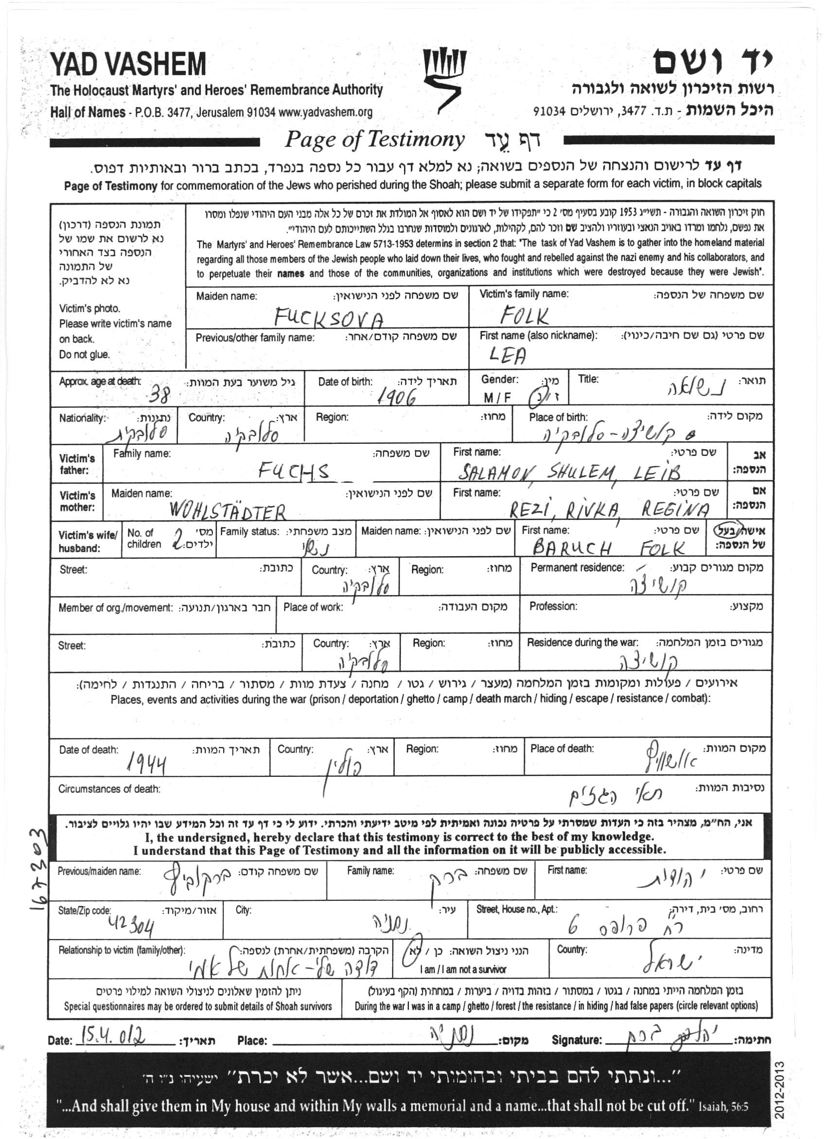 לאה פולק לבית Fuchsova נולדה בKosice שבצ'כוסלובקיה בשנת 1906 לסלמון שולם לייב ורבקה Rezi רגינה לבית Wohlstadter. היא היתה נשואה לברוך. לפני מלחמת העולם השניה התגוררה בKosice שבצ'כוסלובקיה. בזמן המלחמה היא היתה בKosice שבצ'כוסלובקיה. לאה נרצחה בשואה. מקום המוות: Auschwitz שבפולין בשנת 01/01/1944.