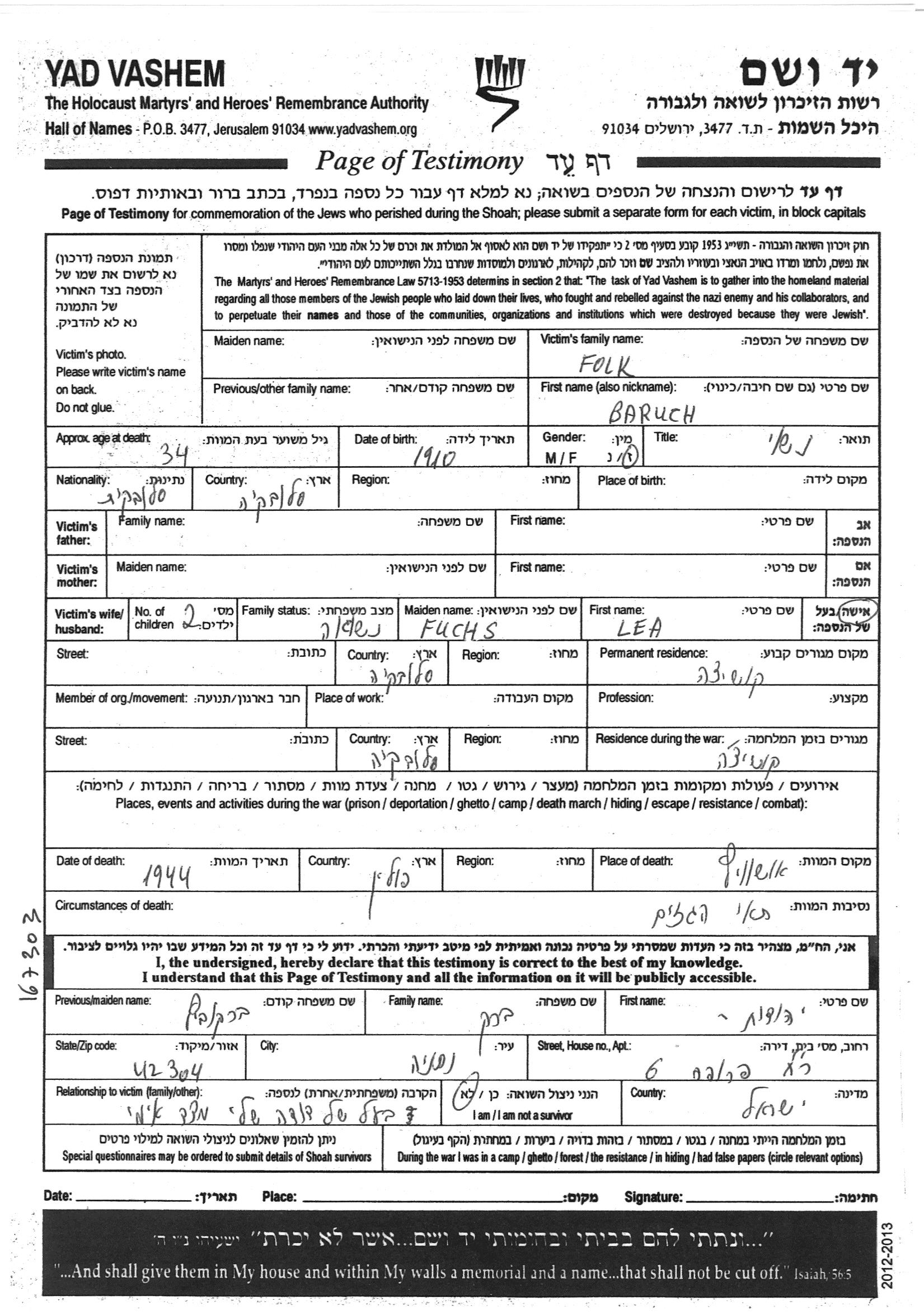 ברוך פולק נולד בSlovakia,צ'כוסלובקיה שבצ'כוסלובקיה בשנת 1910. הוא היה נשוי ללאה לבית Fuchs. לפני מלחמת העולם השניה התגורר בKosice שבצ'כוסלובקיה. בזמן המלחמה הוא היה בKosice שבצ'כוסלובקיה. ברוך נרצח בשואה. מקום המוות: Auschwitz שבפולין בשנת 01/01/1944.