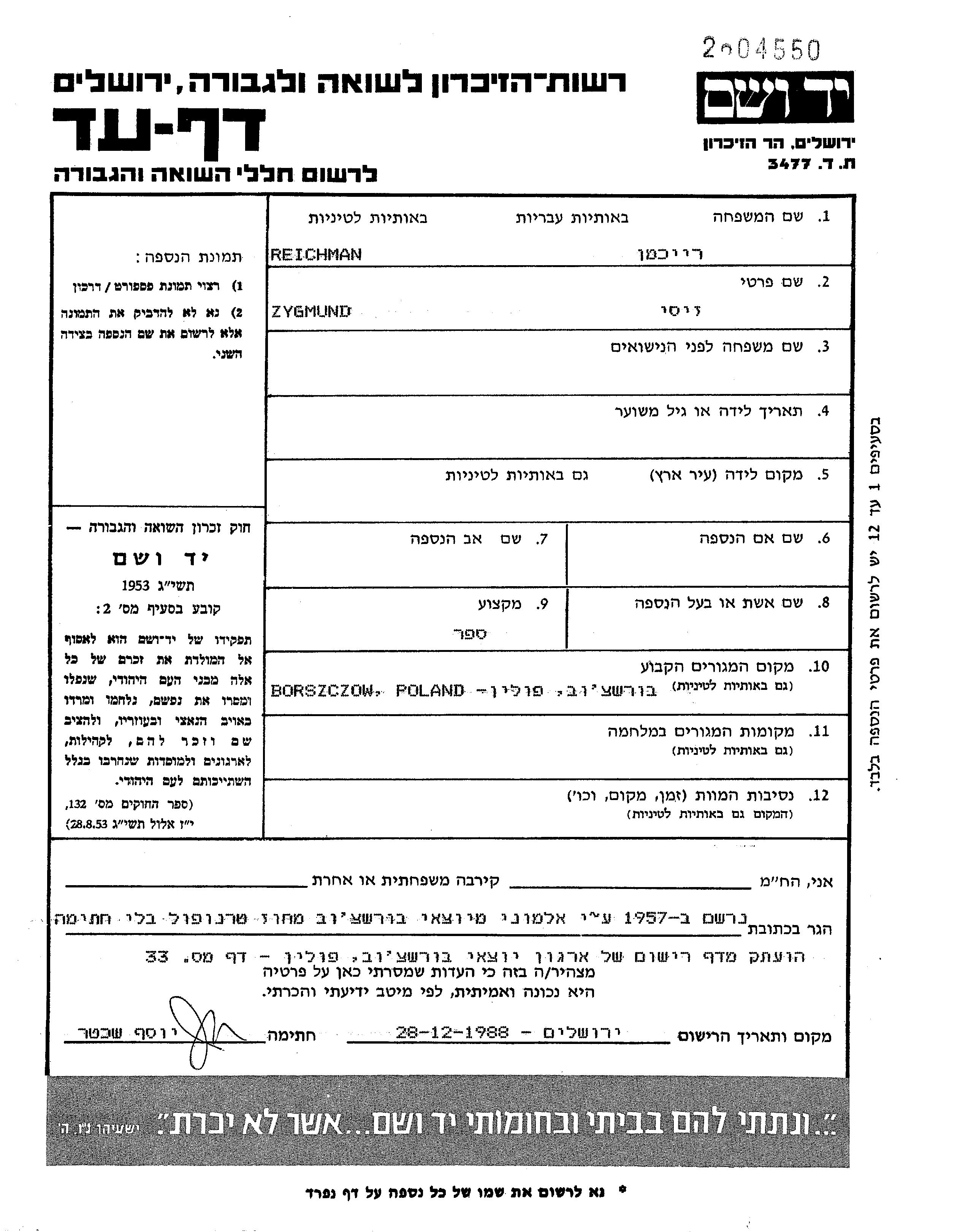 Zygmund Zisi Reichman. הוא היה ספר. לפני מלחמת העולם השניה התגורר בBorszczow שבפולין.