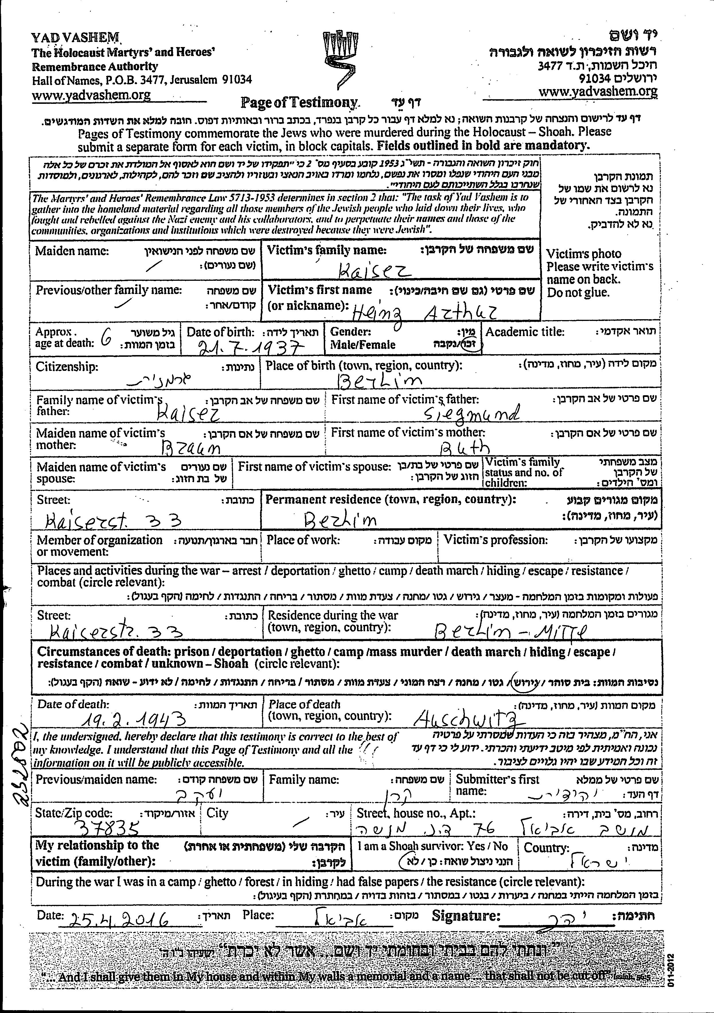 הוא נרצח בשואה. מקום המוות: Auschwitz שבפולין בשנת 19/02/1943.