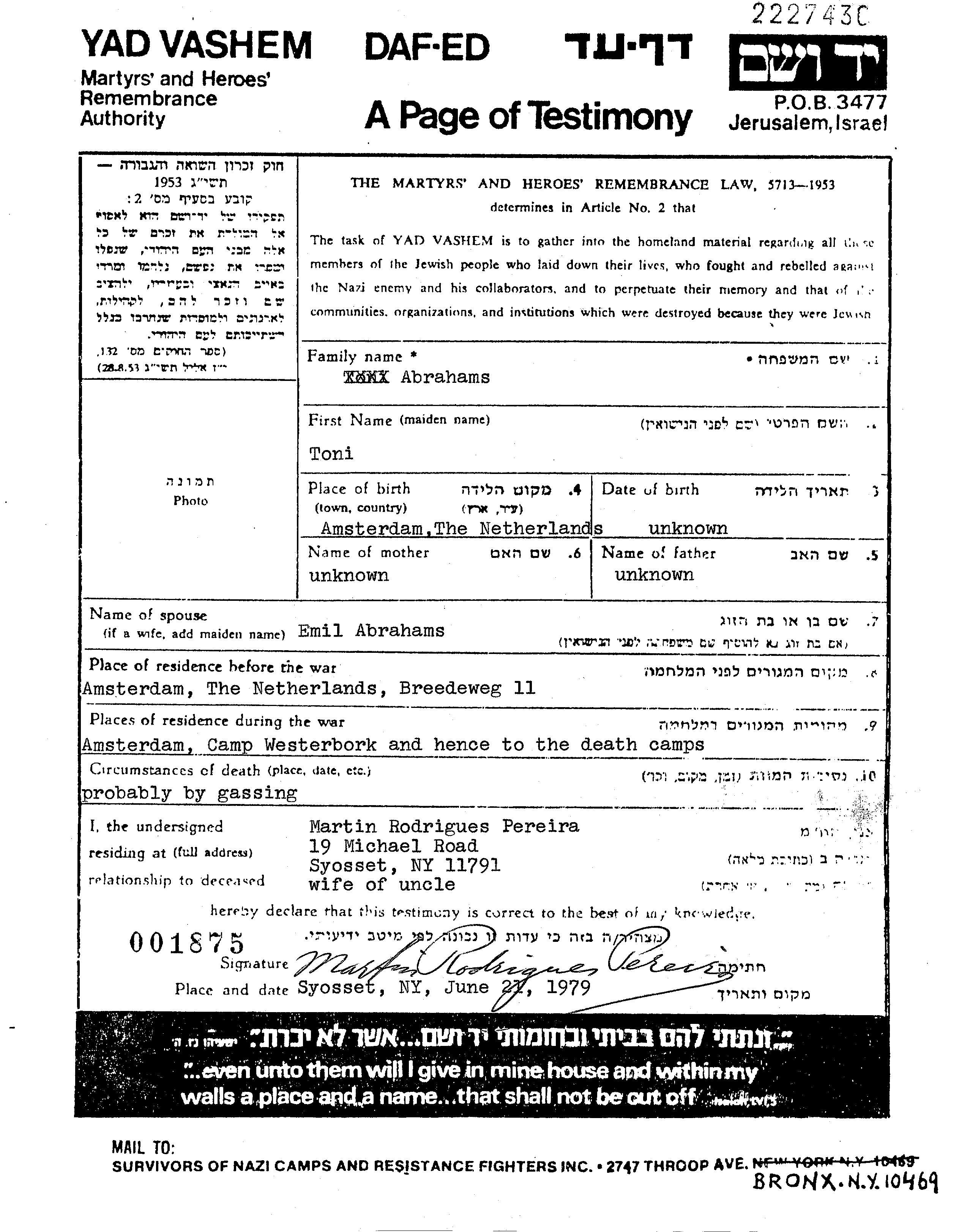 Toni אברהמס נולדה בAmsterdam שבהולנד. היא היתה נשואה לאמיל. לפני מלחמת העולם השניה התגוררה בAmsterdam שבהולנד. בזמן המלחמה היא היתה בAmsterdam שבהולנד.