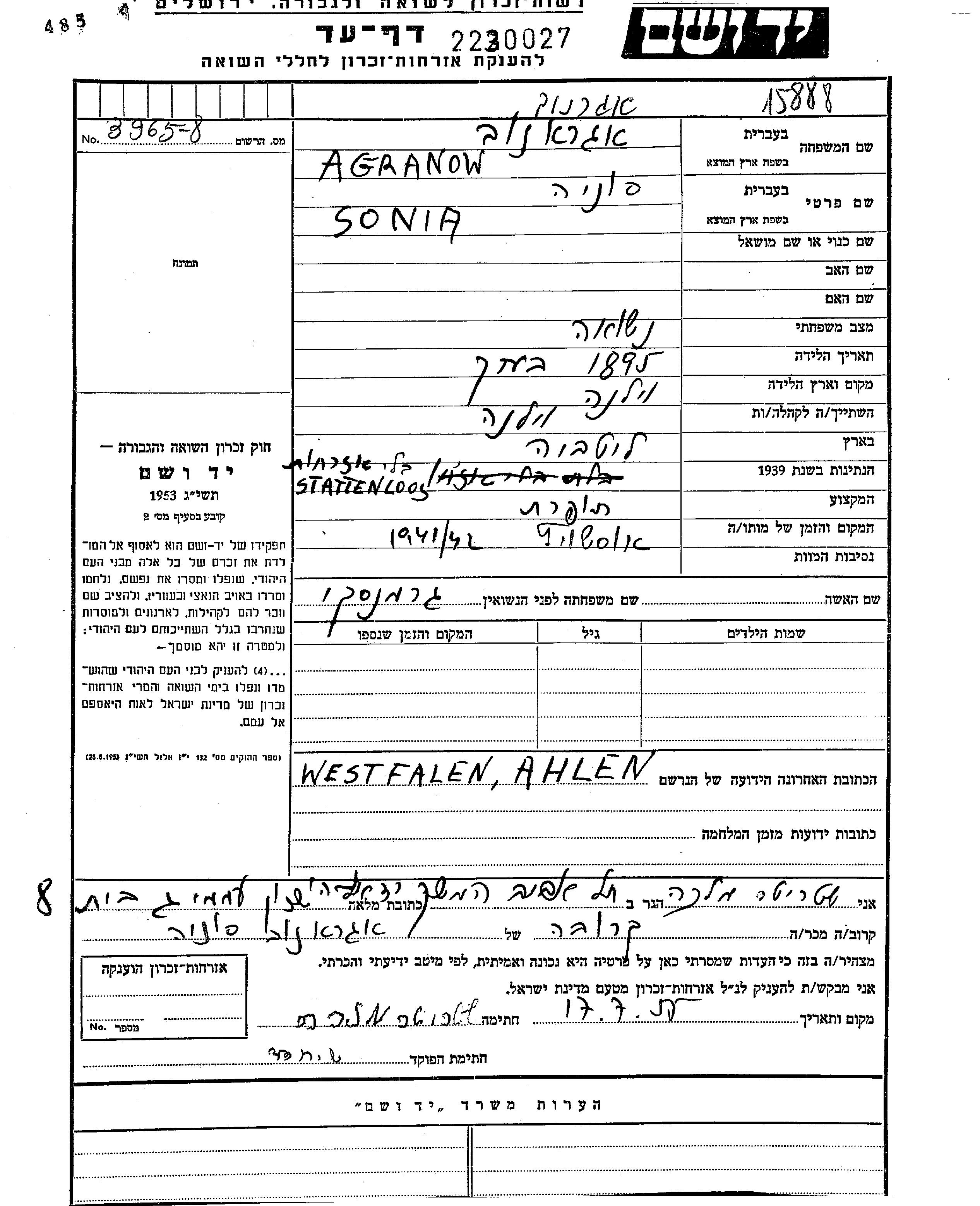 סוניה Agranow לבית גרמנסקי נולדה בWilno שבפולין בשנת 1895. היא היתה תופרת ונשואה. לפני מלחמת העולם השניה התגוררה בWilno שבפולין. בזמן המלחמה היא היתה בליטא. סוניה נרצחה בשואה. מקום המוות: Auschwitz שבפולין בשנת 1941.
