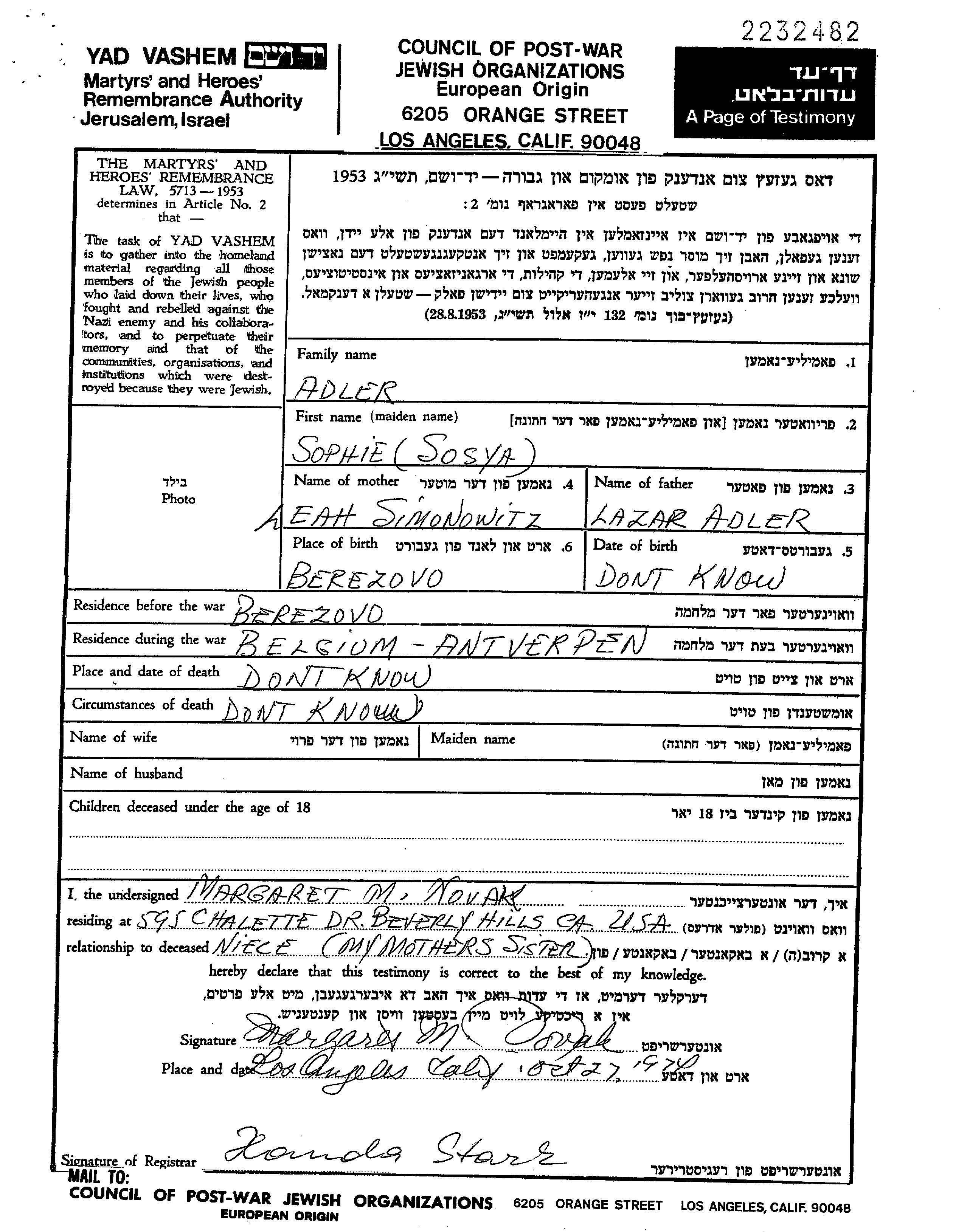 Sophie Sosya אדלר נולדה בBerezovo שבצ'כוסלובקיה ללזר וLeah לבית Simonowitz. לפני מלחמת העולם השניה התגוררה בBerezovo שבצ'כוסלובקיה. בזמן המלחמה היא היתה בAntwerpen שבבלגיה. היא נרצחה בשואה.