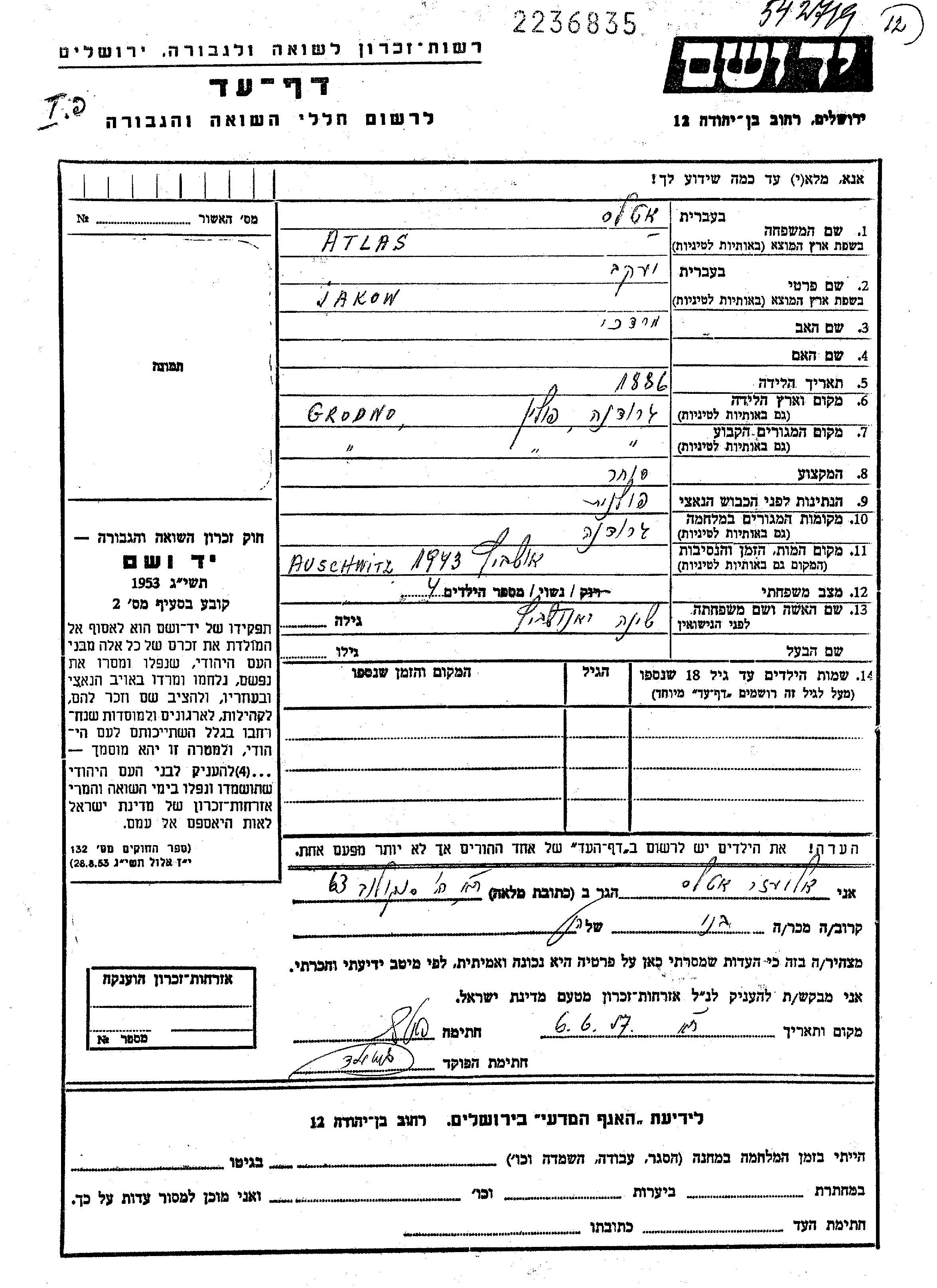 Jakow אטלס נולד בGrodno שבפולין בשנת 1886 למרדכי. הוא היה סוחר ונשוי לSheine. לפני מלחמת העולם השניה התגורר בGrodno שבפולין. בזמן המלחמה הוא היה בGrodno שבפולין.