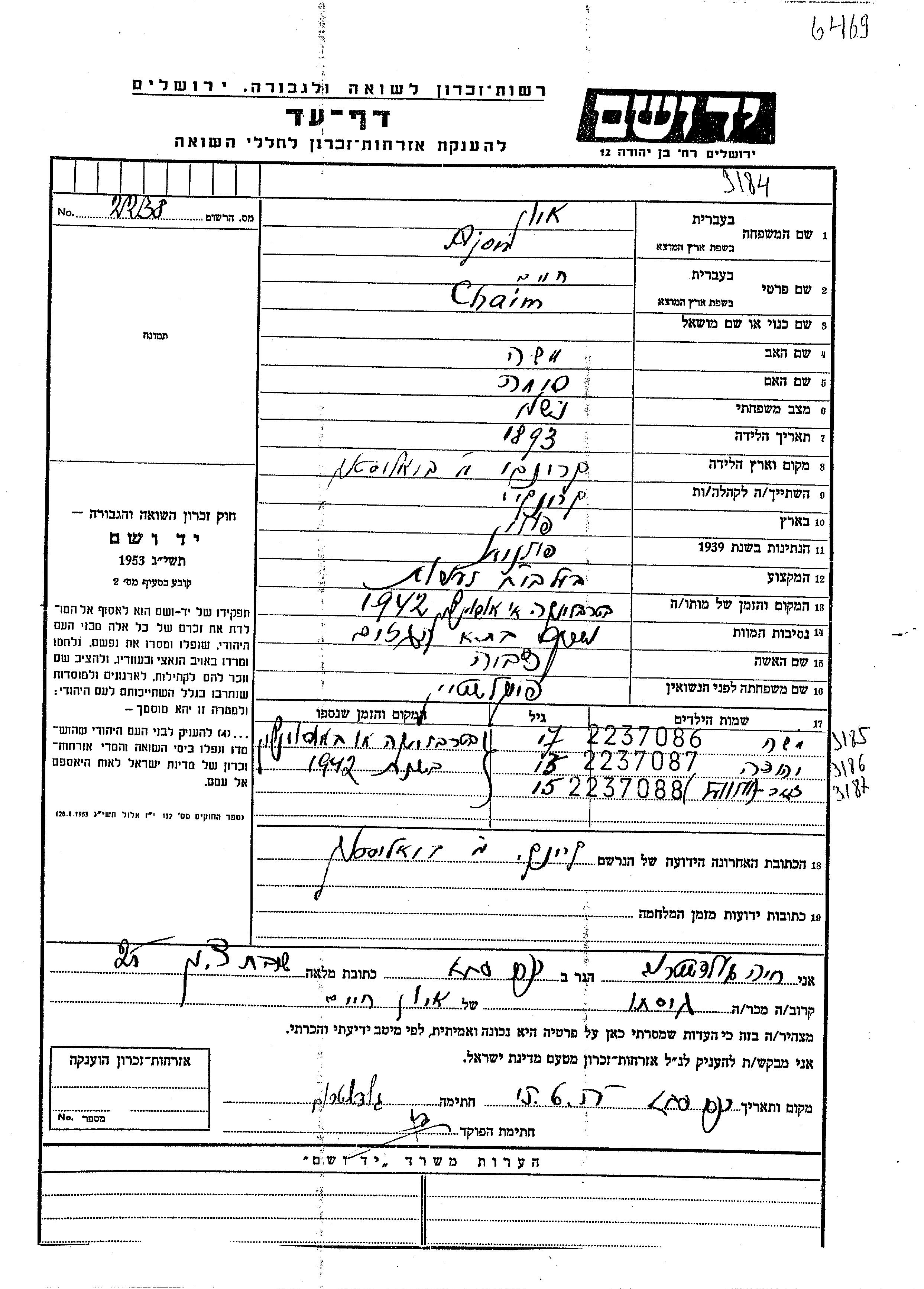 עיר/כפר, גטו/מחנה או אתר רצח או מחוז/אזור או מדינה. שם מקום ניתן לחפש רק בא-ב לטיני.