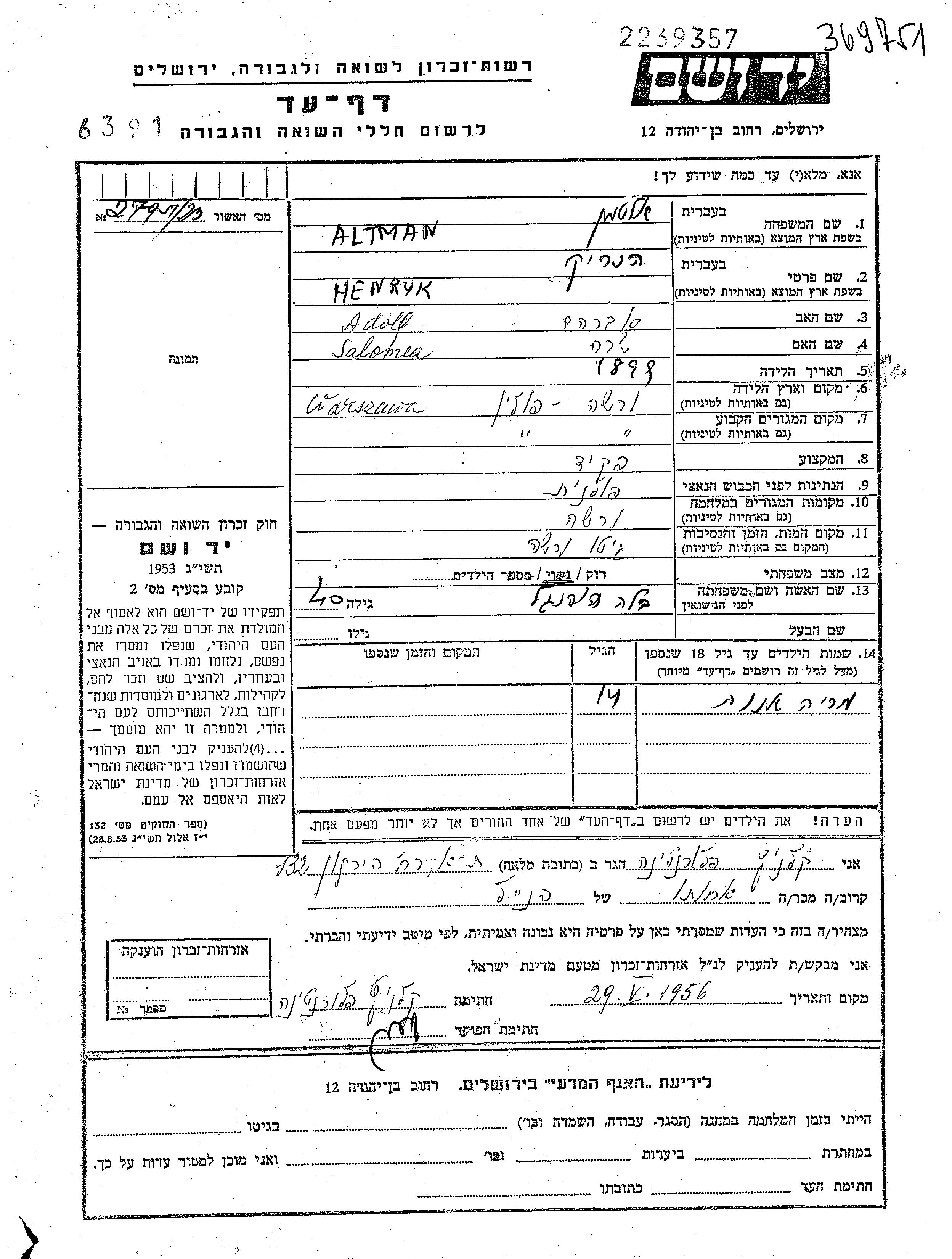 Henryk אלטמן נולד בWarszawa שבפולין בשנת 1899 לאברהם אדולף וSalomea שרה לבית קירשבלום. הוא היה פקיד ונשוי לבלה. לפני מלחמת העולם השניה התגורר בWarszawa שבפולין. בזמן המלחמה הוא היה בWarszawa שבפולין. הוא נרצח בשואה. מקום המוות: Warszawa שבפולין.