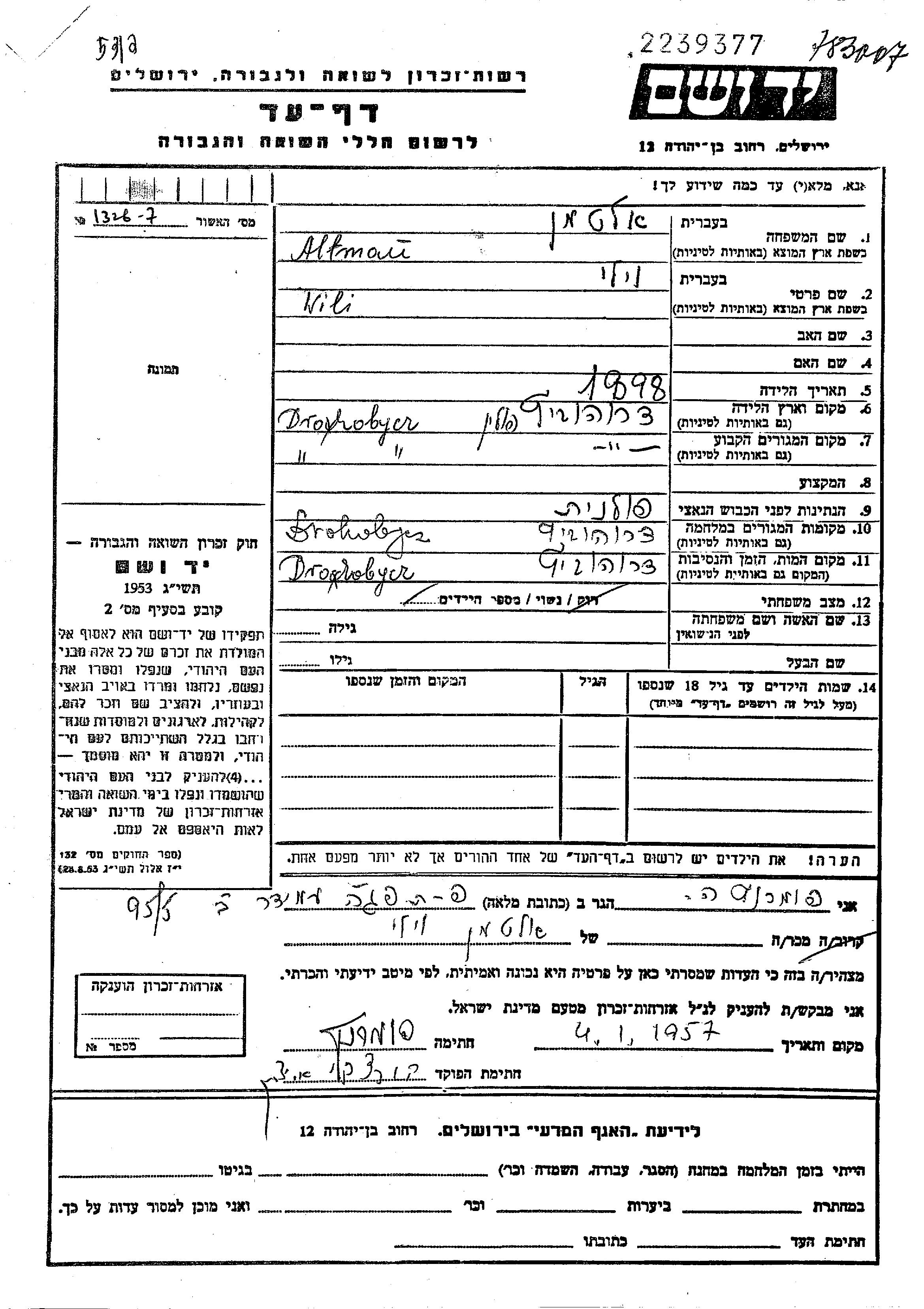 Wili אלטמן נולד בDrohobycz שבפולין בשנת 1898. הוא היה נשוי. לפני מלחמת העולם השניה התגורר בDrohobycz שבפולין. בזמן המלחמה הוא היה בDrohobycz שבפולין.