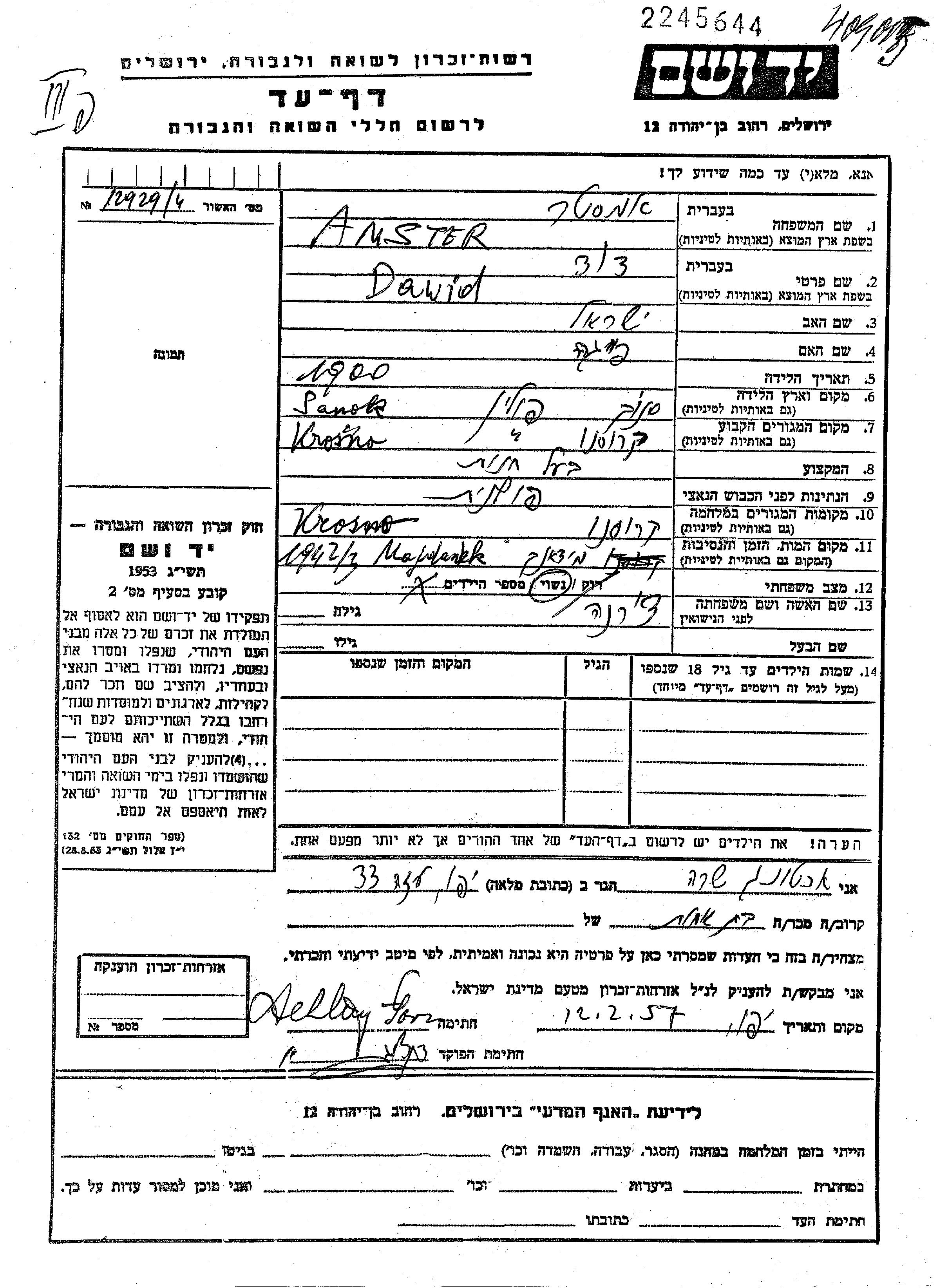 Dawid אמסטר נולד בSanok שבפולין בשנת 1900 לIsrael ופייגה. הוא היה בעל חנות ונשוי לCzarne. לפני מלחמת העולם השניה התגורר בKrosno שבפולין. בזמן המלחמה הוא היה בKrosno שבפולין. הוא נרצח בשואה. מקום המוות: Majdanek שבפולין בשנת 1942.