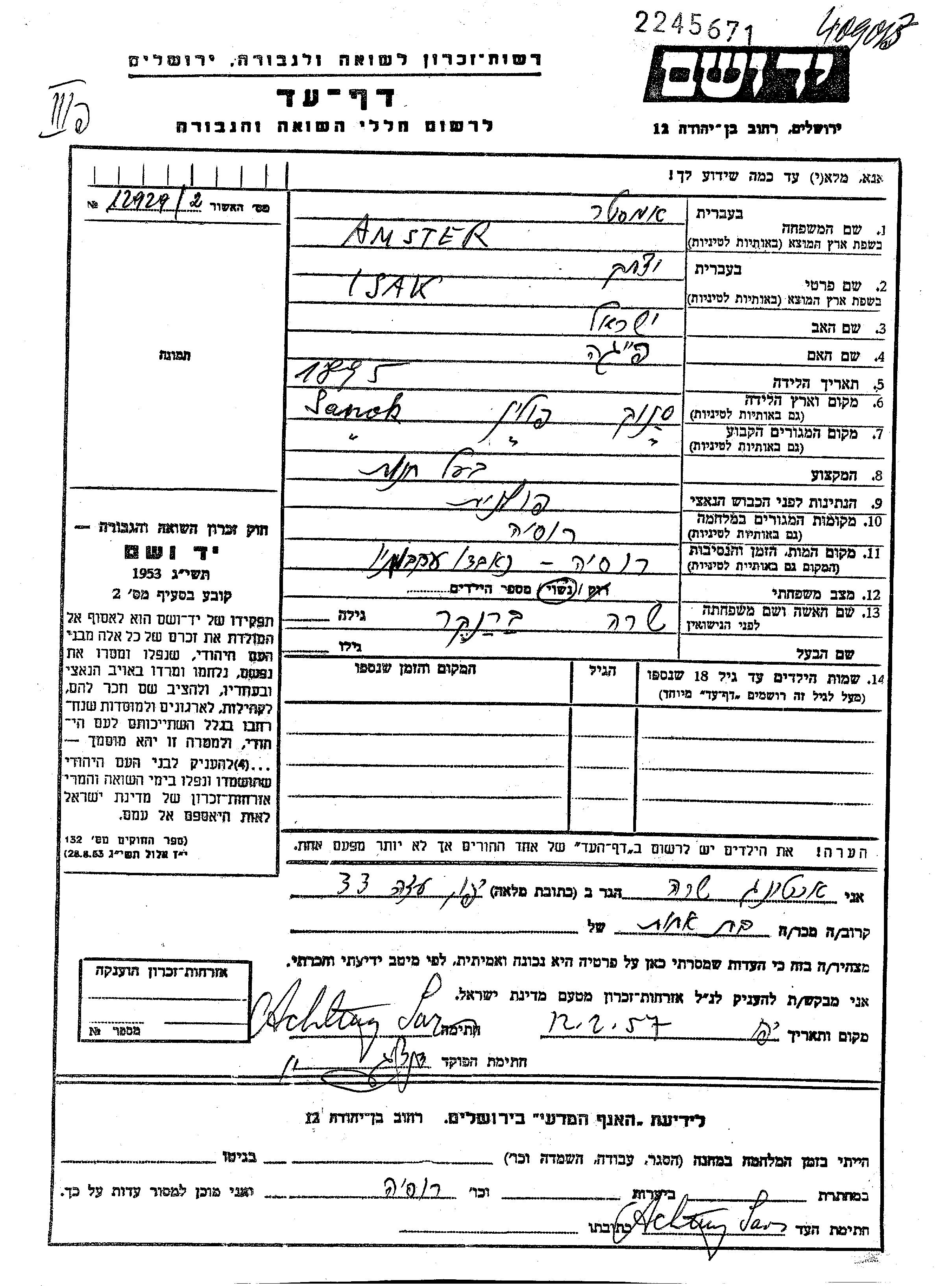 איסק אמסטר נולד בSanok שבפולין בשנת 1895 לIsrael ופייגה. הוא היה בעל חנות ונשוי לשרה. לפני מלחמת העולם השניה התגורר בSanok שבפולין. בזמן המלחמה הוא היה ברוסיה (ברה"מ) שברוסיה (ברה"מ). איסק נרצח בשואה. מקום המוות: רוסיה (ברה"מ) שברוסיה (ברה"מ).