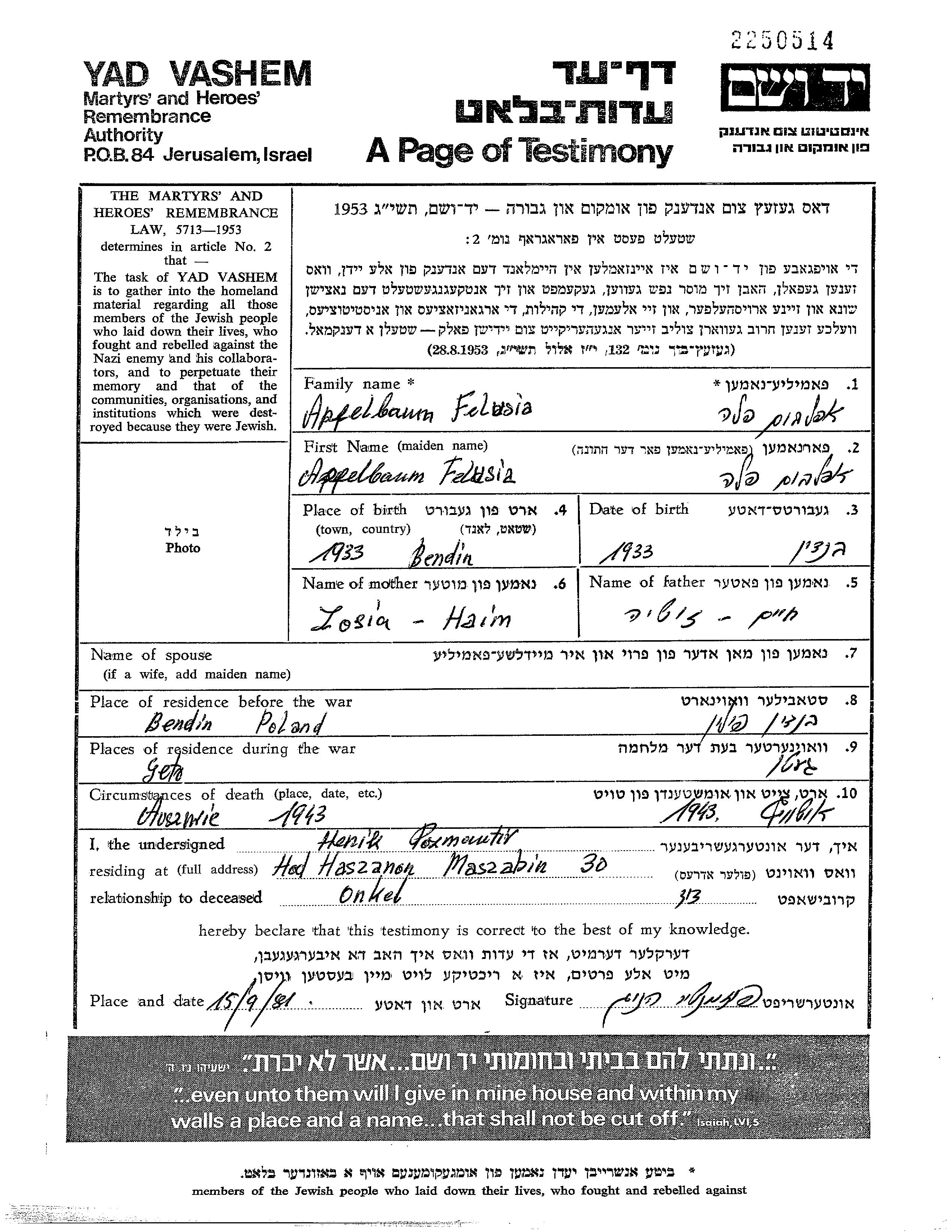 Apfelbaum Fela 1933 Będzin, פולין דף-עד