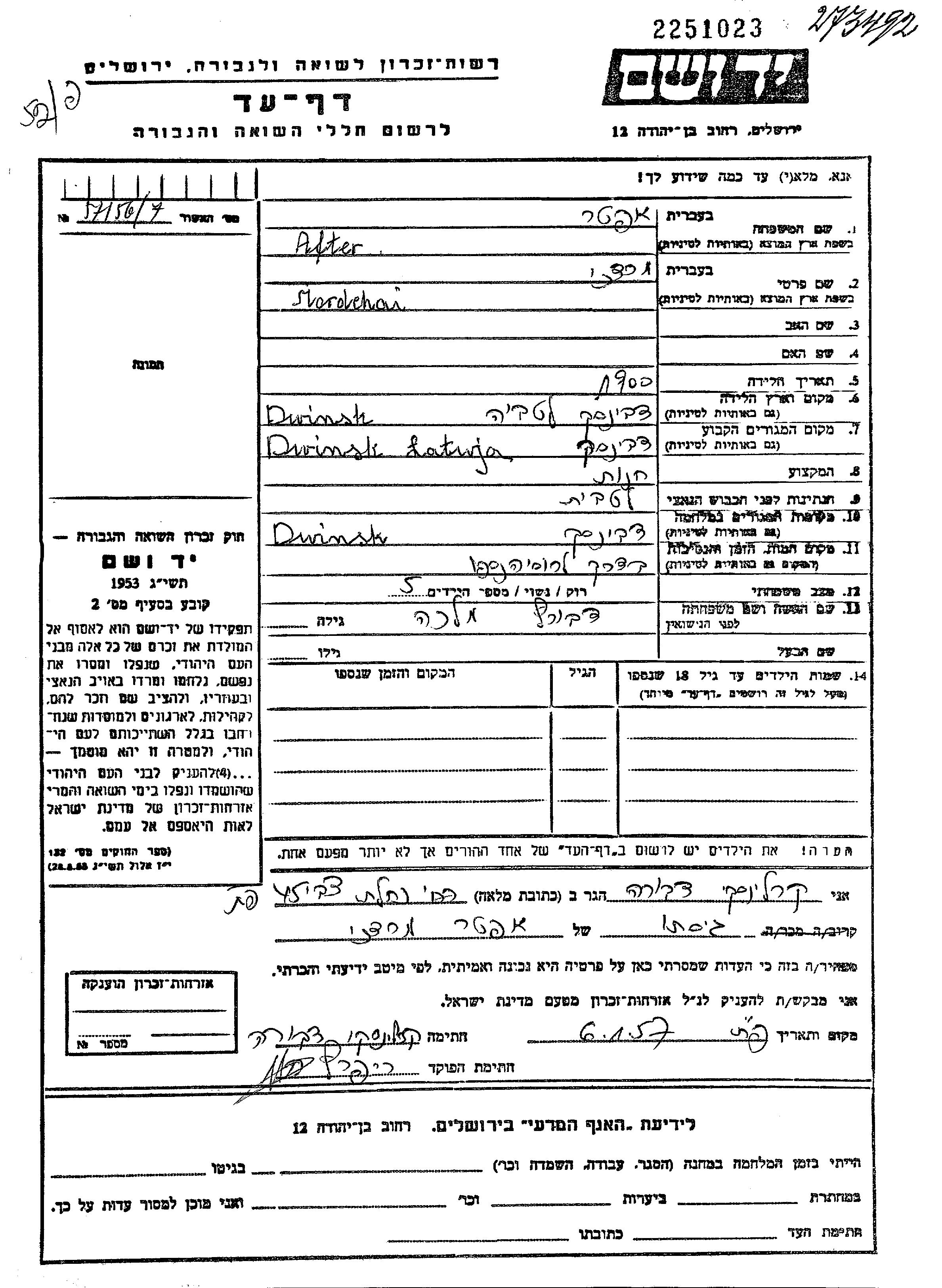Mordechai After אפטר נולד בDvinsk שבלטביה בשנת 1900. הוא היה בעל חנות ונשוי למלכה. לפני מלחמת העולם השניה התגורר בDvinsk שבלטביה. בזמן המלחמה הוא היה בDvinsk שבלטביה. הוא נרצח בשואה.