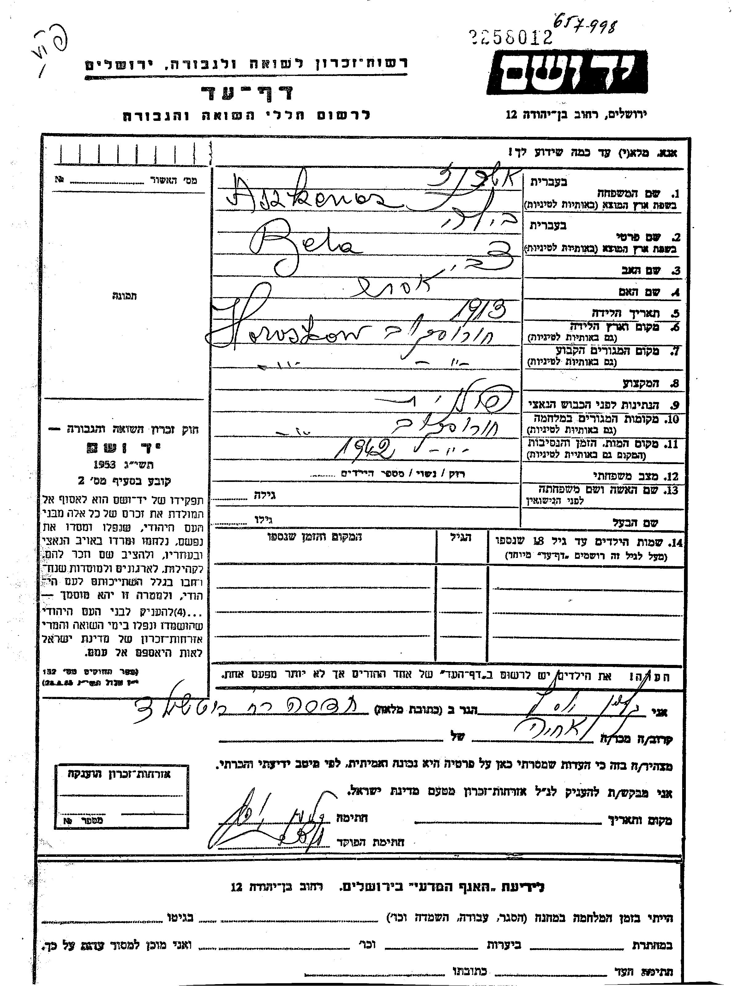 Bila Aszkenaz נולדה בChorostkow שבפולין בשנת 1913 לצבי ואסתר. לפני מלחמת העולם השניה התגוררה בChorostkow שבפולין. בזמן המלחמה היא היתה בChorostkow שבפולין. היא נרצחה בשואה. מקום המוות: Chorostkow שבפולין בשנת 1942.