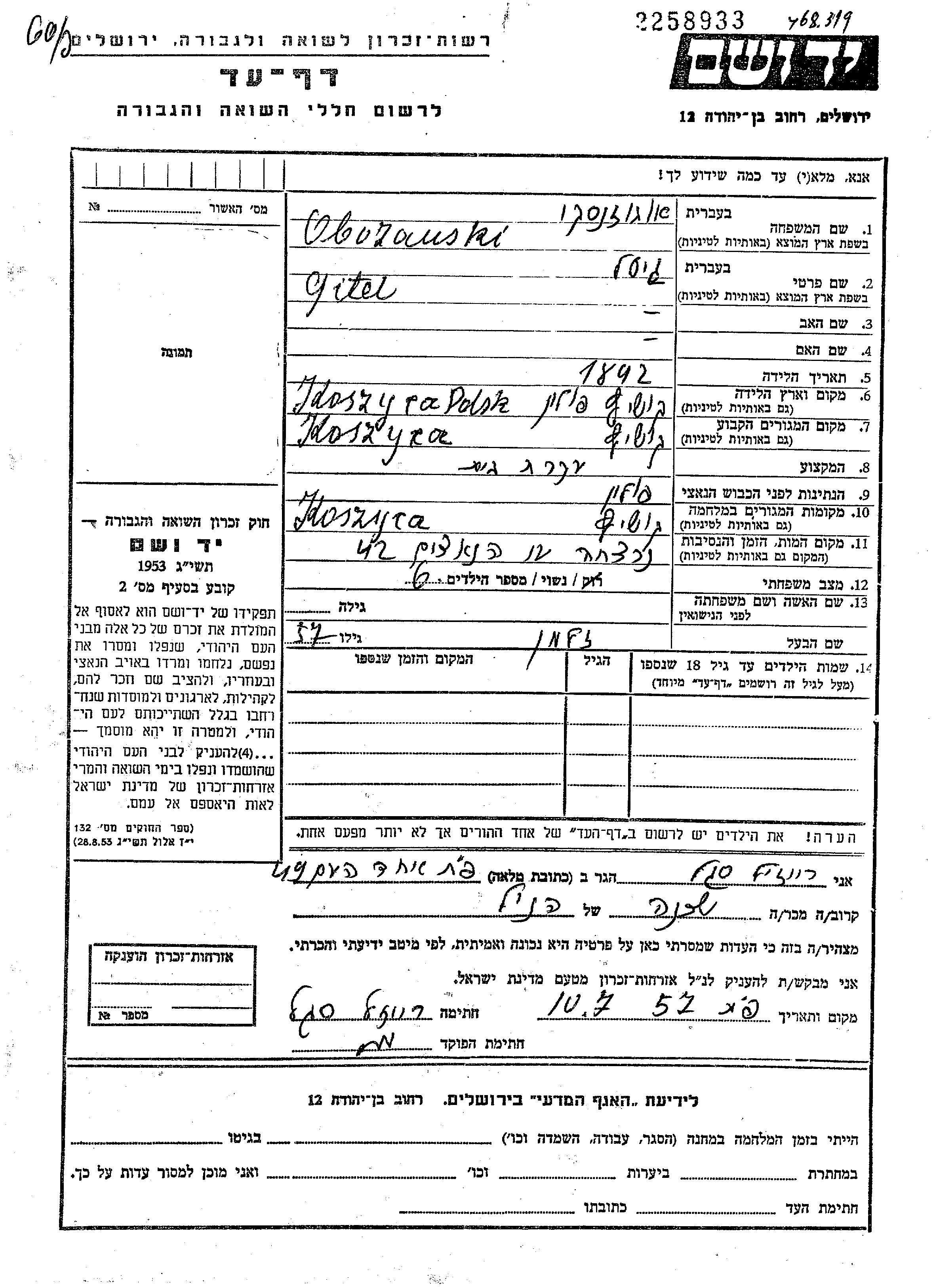 גיטל Obozanski נולדה בKoszyce שבפולין בשנת 1892. היא היתה עקרת בית ונשואה לסלמן. לפני מלחמת העולם השניה התגוררה בKoszyce שבפולין. בזמן המלחמה היא היתה בKoszyce שבפולין.