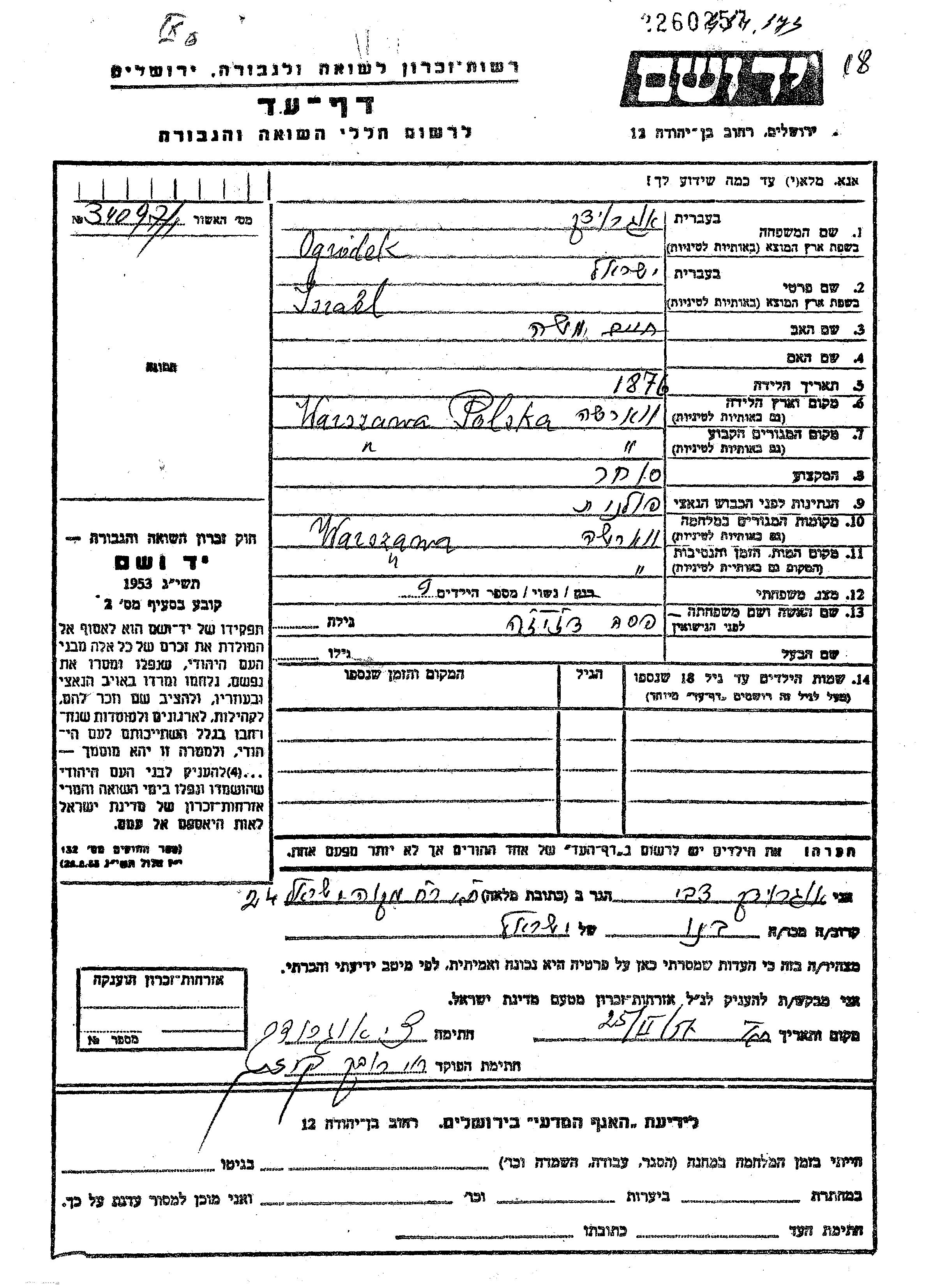 Israel Ogrodek נולד בWarszawa שבפולין בשנת 1876 למשה. הוא היה סוחר ונשוי לפסה. לפני מלחמת העולם השניה התגורר בWarszawa שבפולין. בזמן המלחמה הוא היה בWarszawa שבפולין.