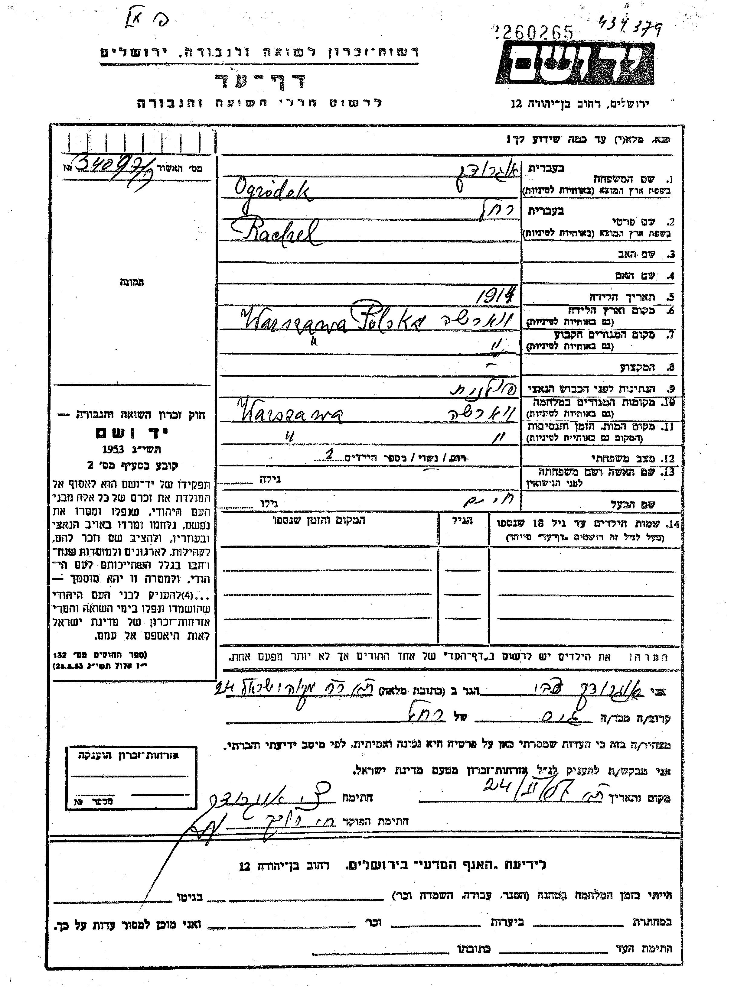רחל Ogrodek נולדה בWarszawa שבפולין בשנת 1914. היא היתה נשואה לחיים. לפני מלחמת העולם השניה התגוררה בWarszawa שבפולין. בזמן המלחמה היא היתה בWarszawa שבפולין.