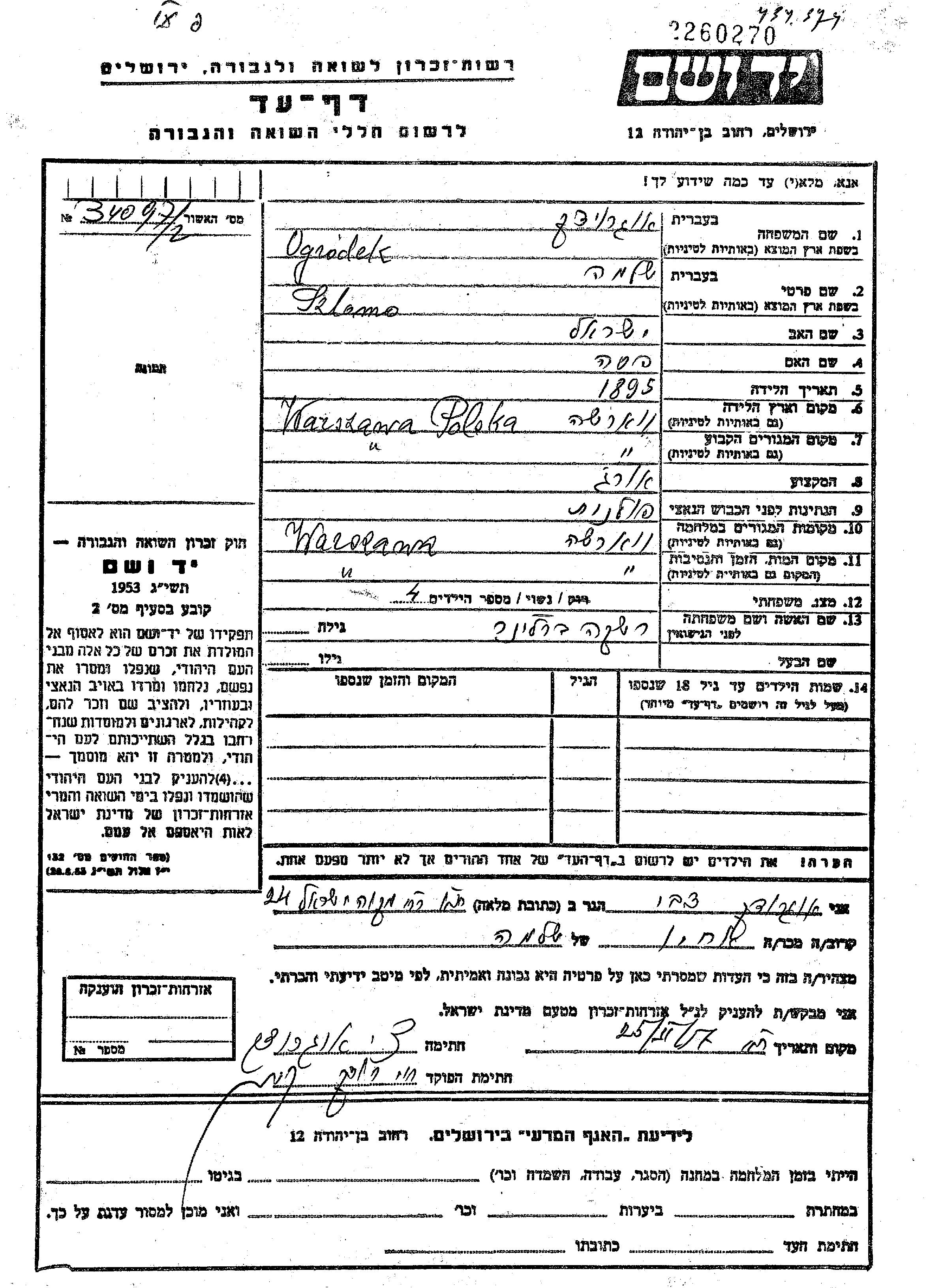 Szlomo Ogrodek נולד בWarszawa שבפולין בשנת 1895 לישראל ופסה לבית דזיזה. הוא היה אורג ונשוי לRaska. לפני מלחמת העולם השניה התגורר בWarszawa שבפולין. בזמן המלחמה הוא היה בWarszawa שבפולין.