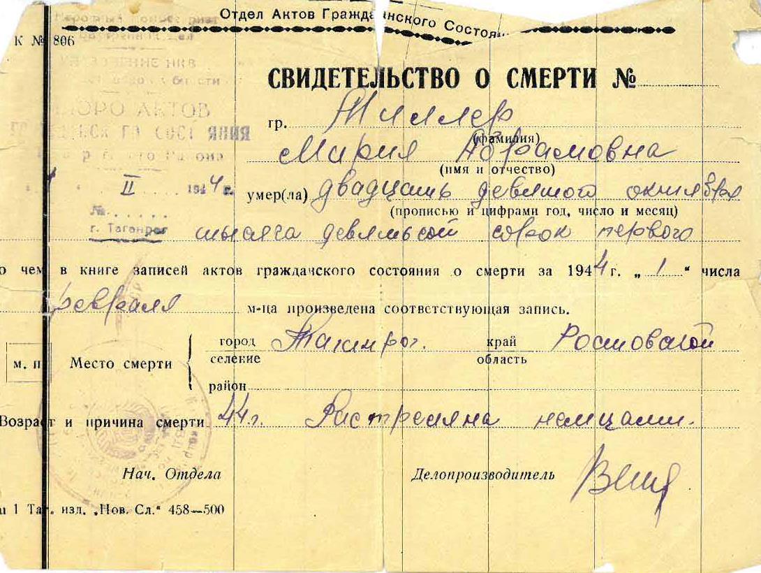מריה נרצחה בשואה. מקום המוות: Taganrog שברוסיה (ברה"מ) בשנת 29/10/1941.