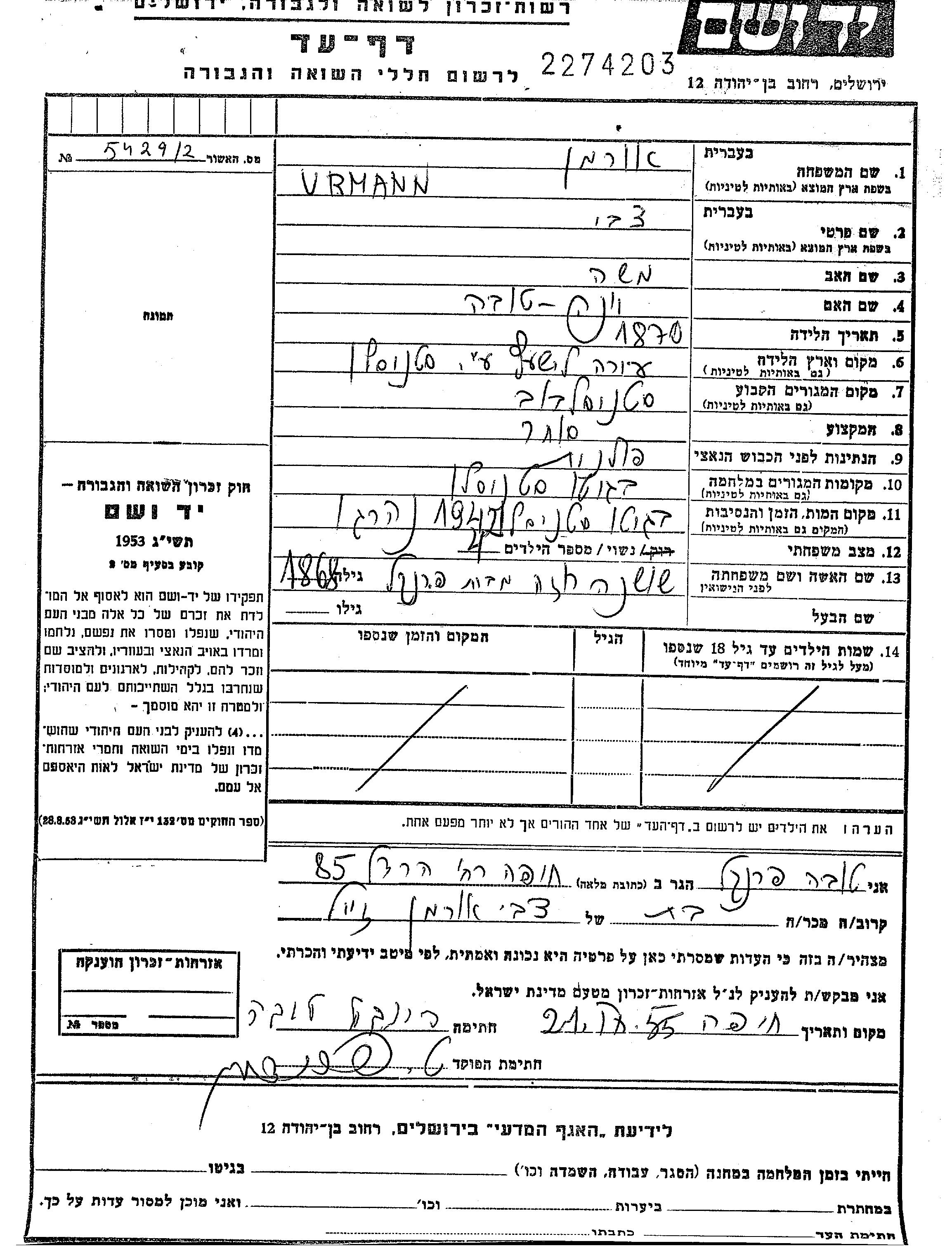 צבי Urmann נולד בLysiec שבפולין בשנת 1870 למשה ויונה טובה. הוא היה סוחר ונשוי לשושנה. לפני מלחמת העולם השניה התגורר בStanislawow שבפולין. בזמן המלחמה הוא היה בStanislawow שבפולין. צבי נרצח בשואה. מקום המוות: Stanislawow שבפולין בשנת 1942.