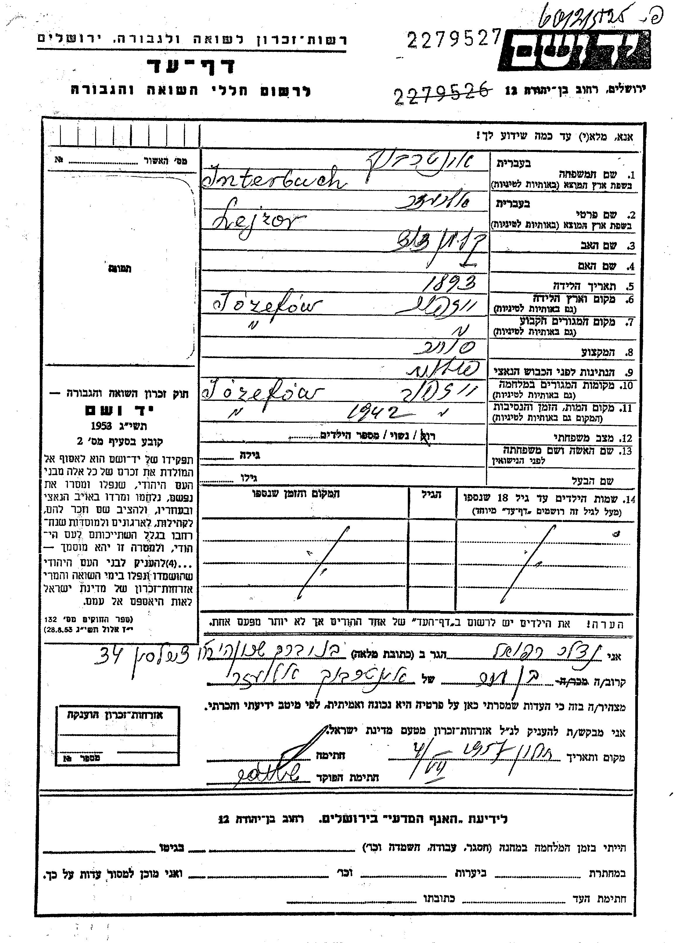 Lejzor Interbuch נולד בJozefow שבפולין בשנת 1893 לדוד קלמן. הוא היה סוחר ונשוי. לפני מלחמת העולם השניה התגורר בJozefow שבפולין. בזמן המלחמה הוא היה בJozefow שבפולין.