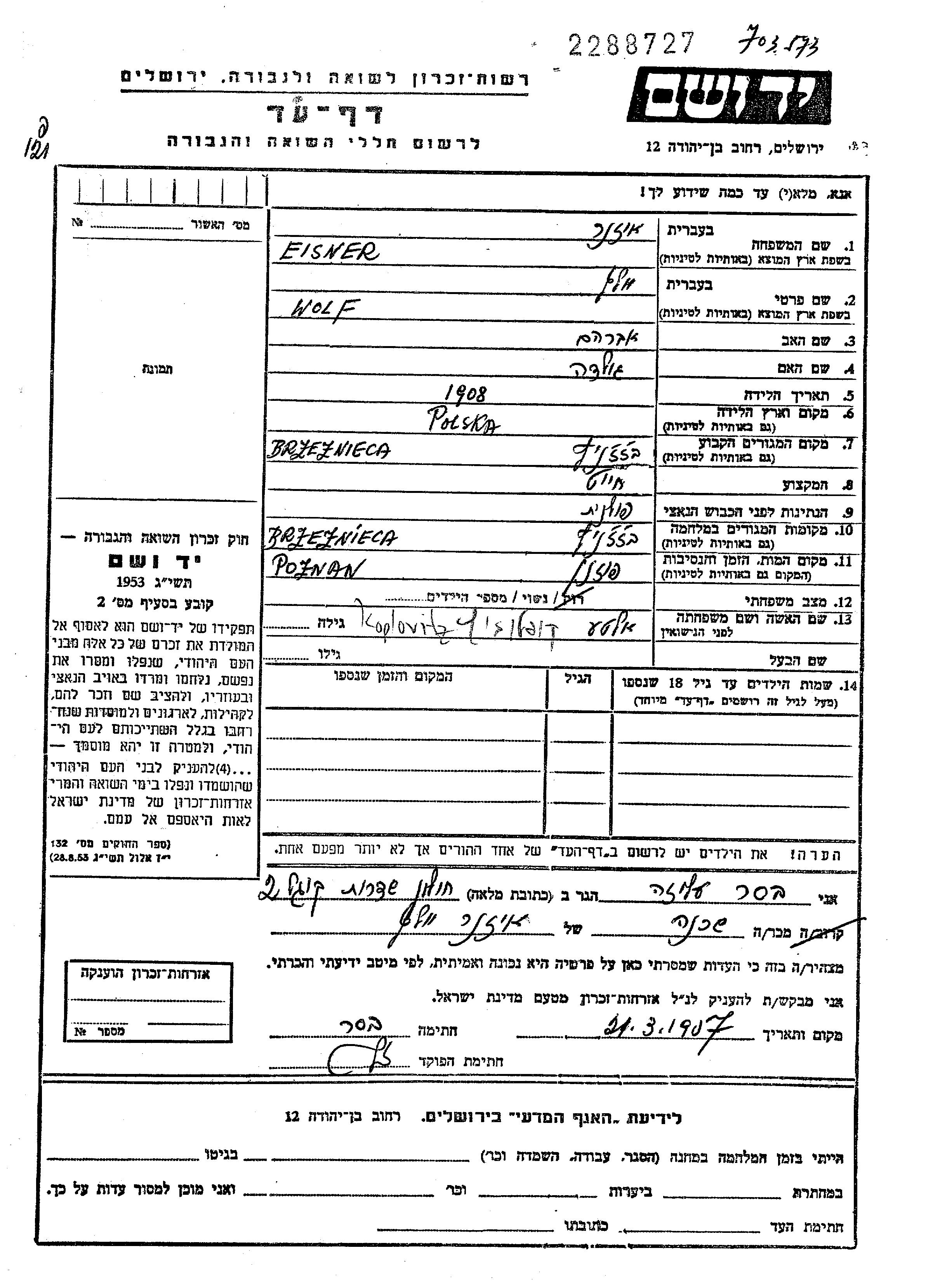 Eisner Wolf 1908 Brzeznica, פולין דף-עד