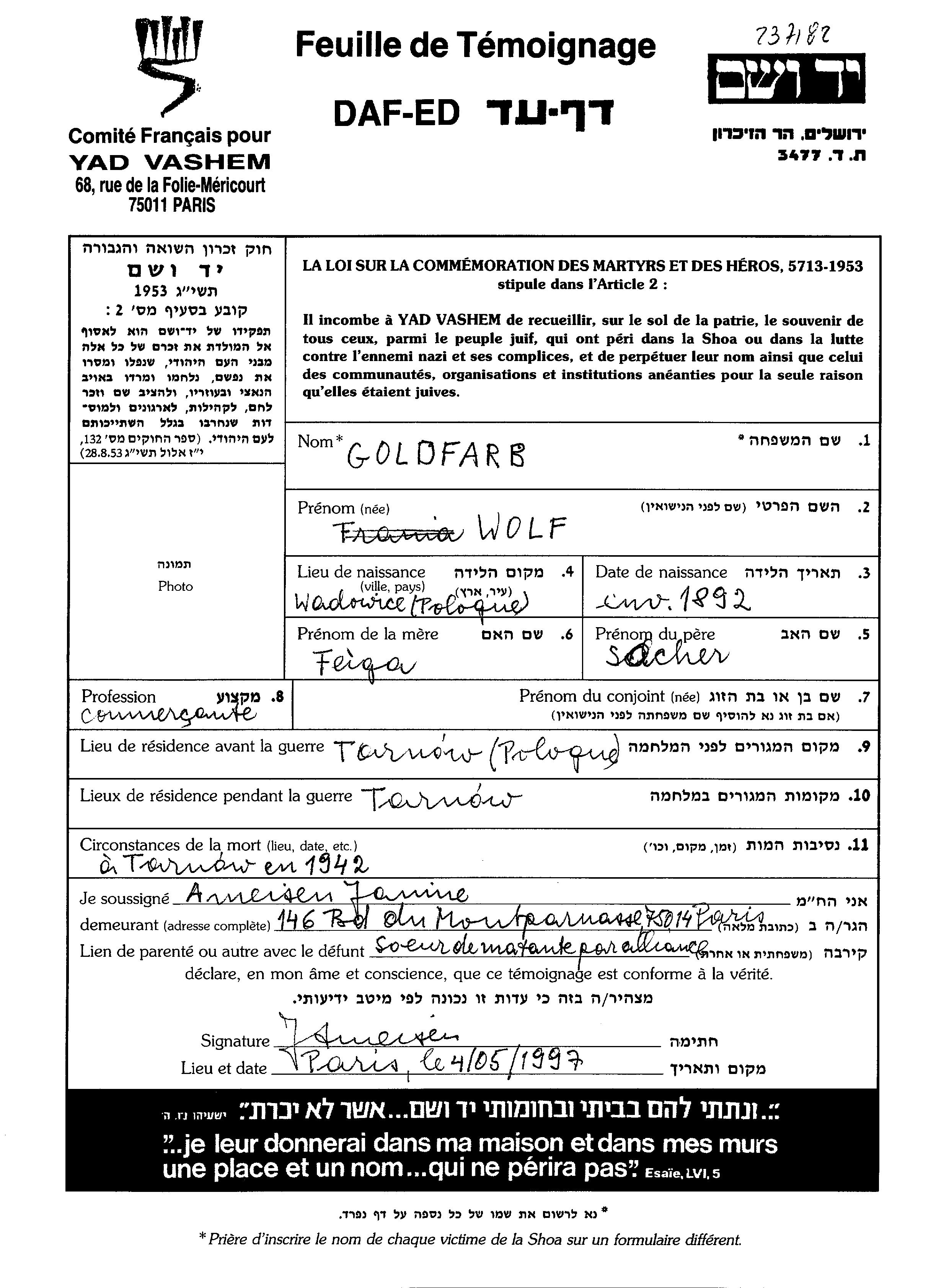 Wolf גולדפרב נולד בWadowice שבפולין בשנת 1892 לSacher ופייגה. הוא היה סוחר. לפני מלחמת העולם השניה התגורר בTarnow שבפולין. בזמן המלחמה הוא היה בTarnow שבפולין.